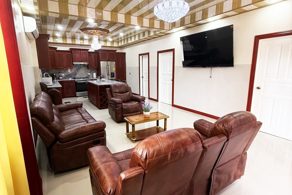 Relájate en este espacioso apartamento de 3 dormitorios y 2,5 baños a solo 9 minutos del Estadio Nacional y a 25 minutos de Georgetown. Perfecta para familias, grupos y aficionados a la CPL, esta moderna unidad cuenta con aire acondicionado, televisores inteligentes, wifi de alta velocidad y jacuzzi. Disfruta de total privacidad, aparcamiento gratuito, llegada flexible y un servicio opcional de traslado al aeropuerto. Situado en un barrio tranquilo y en desarrollo, cerca de tiendas, restaurantes y carreteras principales para acceder fácilmente a todo lo que ofrece East Bank Demerara.