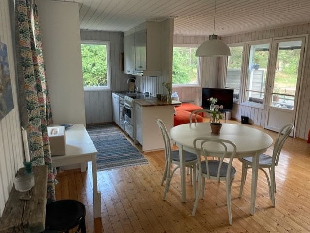 En una fantástica parcela junto al lago con sol todo el día y vistas al lago desde el alojamiento, esta casa de 55 metros cuadrados se encuentra en parte de nuestra gran parcela. Hay una sauna, un muelle de baño, una playa de arena y zonas con césped. En invierno perforamos un fregadero de hielo para nadar. Salón comedor con mesa, sofá y chimenea. Cocina bien equipada con lavavajillas, microondas, horno, nevera y congelador. Dormitorio con cama de 180 cm. Baño con ducha y retrete de compostaje. Lavadora y secadora. Ciudad de Estocolmo a 25 km