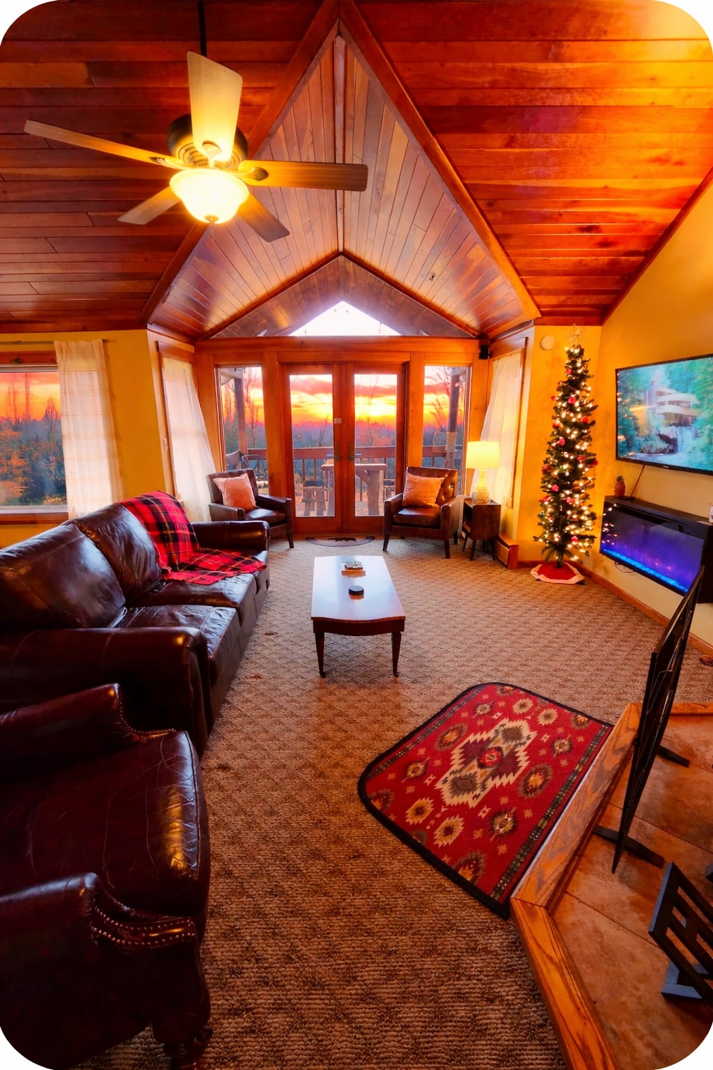 Smiling Mountain es una casa del árbol de madera, piedra y vidrio tallada a mano cerca de Seven Springs, Hidden Valley Fallingwater y GAP Trail. Esta casa de 4BDR de planta abierta cuenta con una puerta de cristal de acordeón de 19'que se abre a una terraza elevada. Completa con 2 chimeneas de leña, cocina gourmet, mesa de comedor para 12 personas (una en el interior y otra en el exterior), la casa muestra arte de viajes mundiales y accesorios de iluminación hechos a mano. A pocos pasos del área natural de Roaring Run: caminata, bicicleta, esquí o simplemente relájate.