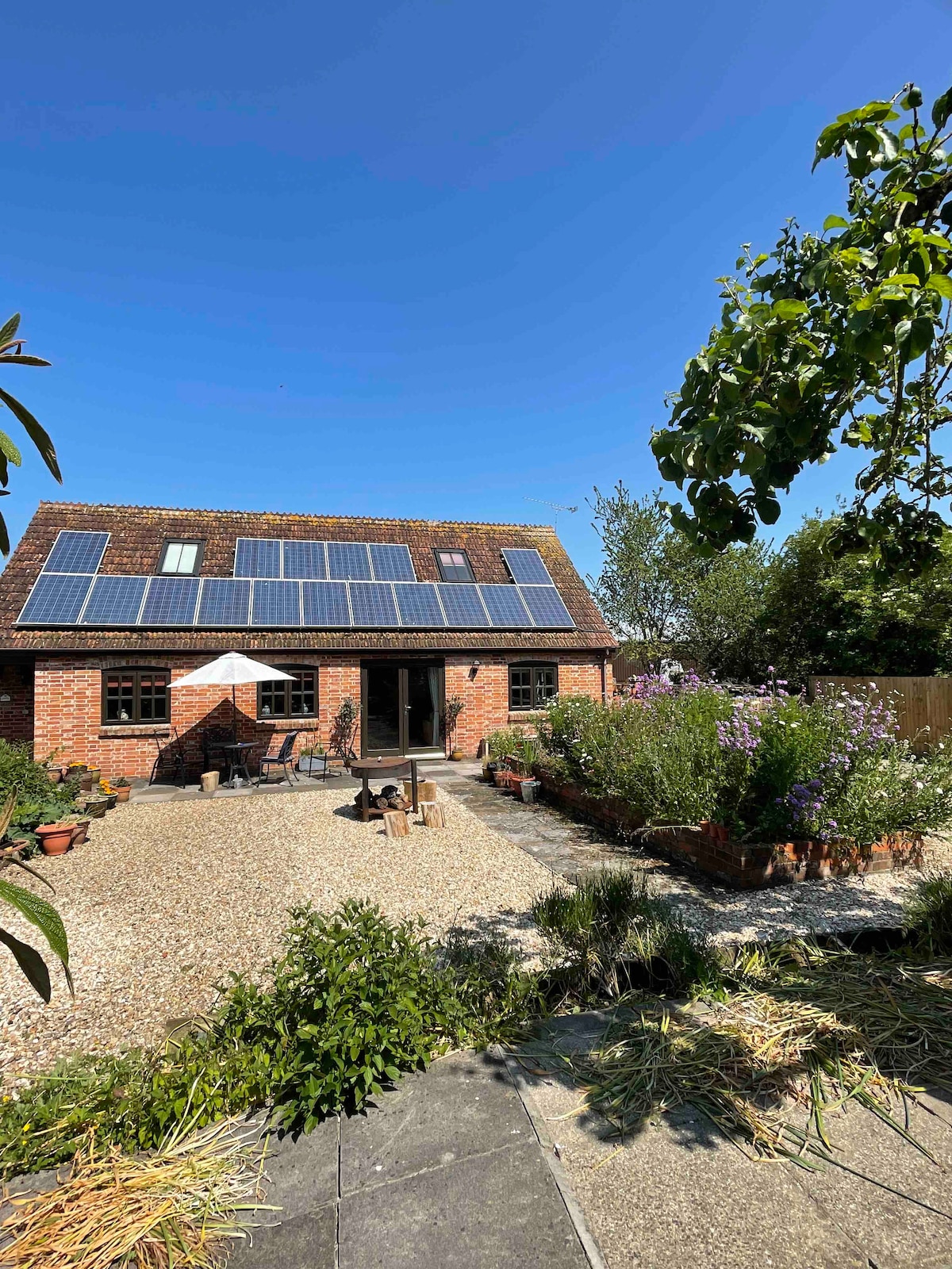 Vuelve a conectar con la naturaleza en esta lujosa cabaña ubicada en una tranquila aldea. Encuentra tranquilidad en la terraza rodeada de impresionantes vistas o relájate en medio de una decoración cuidadosa y elegantes acabados modernos en el interior de vigas de roble a la vista. ¡Blue Vale es nuevo a partir de junio de 2018! Ayudamos a diseñar este edificio con estructura de roble verde y hemos participado en todo el proceso de construcción, haciendo gran parte nosotros mismos. Para nuestra combinación de colores hemos utilizado diferentes tonos de azul en todo momento, jugando con el nombre de Blue Vale. El mobiliario y los toques finales son de alto nivel para ayudar a promover un acabado cómodo y lujoso. Hay un estilo ecléctico que combina el campo moderno con acabados industriales. La ropa de cama y las toallas de algodón de lujo de hilo alto, los televisores inteligentes de pantalla plana grandes y los artículos de aseo de lujo de Neals Yard ayudan a dar los toques finales de alta gama que apreciaríamos si nos quedáramos lejos de casa. Blue Vale es completamente independiente, pero se encuentra en los terrenos de nuestra casa familiar. La sala de estar al aire libre está protegida por un enrejado en el lado del jardín con campos en el otro. Te invitamos a pasear por nuestro jardín. Podemos ser tan interactivos como quieras. Al vivir en los mismos terrenos, estamos cerca si es necesario. Te daremos la bienvenida cuando llegues, pero respetaremos tu privacidad. El glorioso paisaje de Blackmore Vale es un tapiz de campos verdes cultivados con una pizca de pueblos ingleses, de los cuales Sandley es uno. Salga a caminar (o en bicicleta, utilizando nuestras bicicletas disponibles) por los carriles del país y aventúrese a lo largo de una red de senderos para descubrir esta parte virgen de Dorset. Visita Stourhead, pasea por las antiguas ciudades de Sherborne o Shaftesbury o descubre la hermosa costa jurásica. Visita el parque safari Longleat, el Museo del Motor Haynes, Monkey World y el Museo del Aire de Yeovilton. Sandley es una aldea tranquila con el pueblo vecino de Buckhorn Weston a solo una milla de distancia. Aquí se encuentra el pub Stapleton Arms. Estamos a 10 minutos de las ciudades de Gillingham y Wincanton, donde hay varios supermercados, tiendas y servicios. Hay una estación de tren en Gillingham que tiene una ruta directa a Londres en menos de 2 horas. Las ciudades más grandes de Bath y Salisbury están a menos de una hora en coche y se tarda alrededor de una hora en conducir hasta la hermosa costa jurásica. Las ciudades históricas de Shaftesbury y Sherborne están a solo 15 y 20 minutos, respectivamente. Las tranquilas carreteras rurales y los caminos de herradura de Blackmore Vale son excelentes para ir en bicicleta y caminar. Blue Vale se encuentra en los terrenos de nuestra casa familiar. Hay una instalación de un dormitorio B&B en la planta baja de nuestra casa.