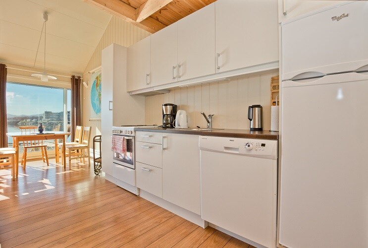 Moderno apartamento de 40 m2 + 20 m2 de terraza frente al mar, en Rorbu en el más exterior de Kaldfarnes en la Senja exterior. Increíble naturaleza y vistas, un eldorado para los amantes del aire libre. El apartamento cuenta con cocina av. con nevera integrada, lavavajillas, estufa y equipo de cocina. Baño con cabina de ducha y lavadora, entre otras cosas. Wifi + TV inteligente con canal digital (antena parabólica). 3 camas en dormitorios (litera familiar; 150 + 90) + amplio sofá cama en la sala de estar. Excelente apartamento para 3 personas, pero puede alojarse hasta 5 personas si lo deseas.