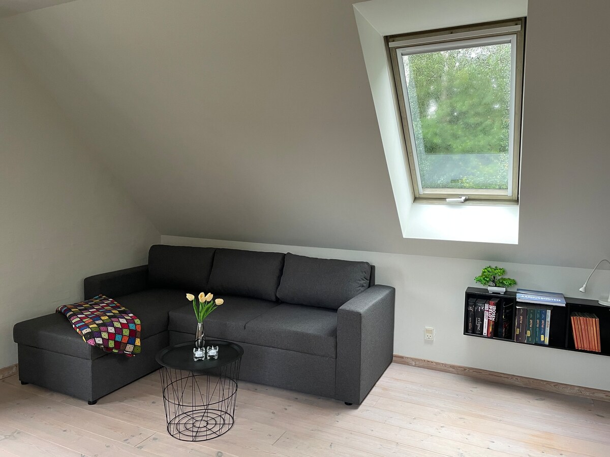Luminoso apartamento de 24 metros cuadrados recién reformado en una zona tranquila con vistas a la ciudad de Grenaa. Se encuentra a 7 minutos a pie del centro de Grenaa. La cocina de té se puede utilizar para platos ligeros. El apartamento está conectado a nuestra casa, que tiene su propia entrada al apartamento y su propio baño. La distancia a la playa de Grenaa es de 5,8 km, Djurs Sommerland está a solo 22 km de Grenaa.