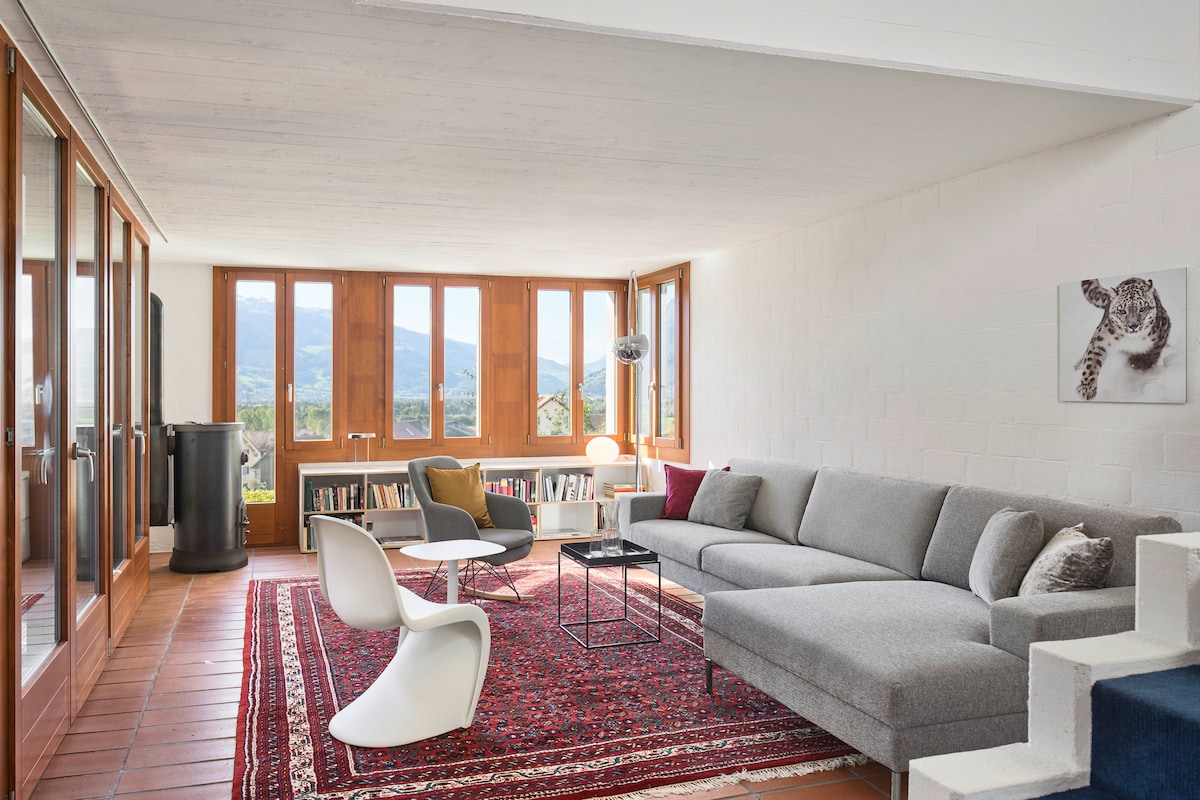 Nuevo y moderno apartamento de invitados en la parte anexa de la casa. El apartamento tipo estudio tiene tres habitaciones conectadas por 4 o 7 escalones. La habitación central con salón-comedor y cocina es muy luminosa y tiene vistas al castillo de Sargans. El asiento superior ofrece una gran vista panorámica del castillo y Gonzen. El apartamento de invitados es ideal para 2-4 personas. Cama doble grande, litera en la habitación superior, sofá cama o cama plegable. Bajo petición, uso de jacuzzi, sauna y lavadora.