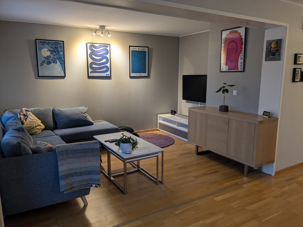 Apartamento céntrico con 3 dormitorios A 2 km del aeropuerto de Værnes Wifi. Estacionamiento de tu propio coche. Vista. Tranquilo. Check-in y check-out autónomos. Incluye ropa de cama y toallas Cafetera A poca distancia del aeropuerto/tren/autobús/centro comercial Aeropuerto de Trondheim: 2 km Estación de trenes del infierno: 0,8 km Parada de autobús. 0,7 km Centro comercial: 1,5 km Playa a 1 km. Centro de Stjørdal: 4,5 km