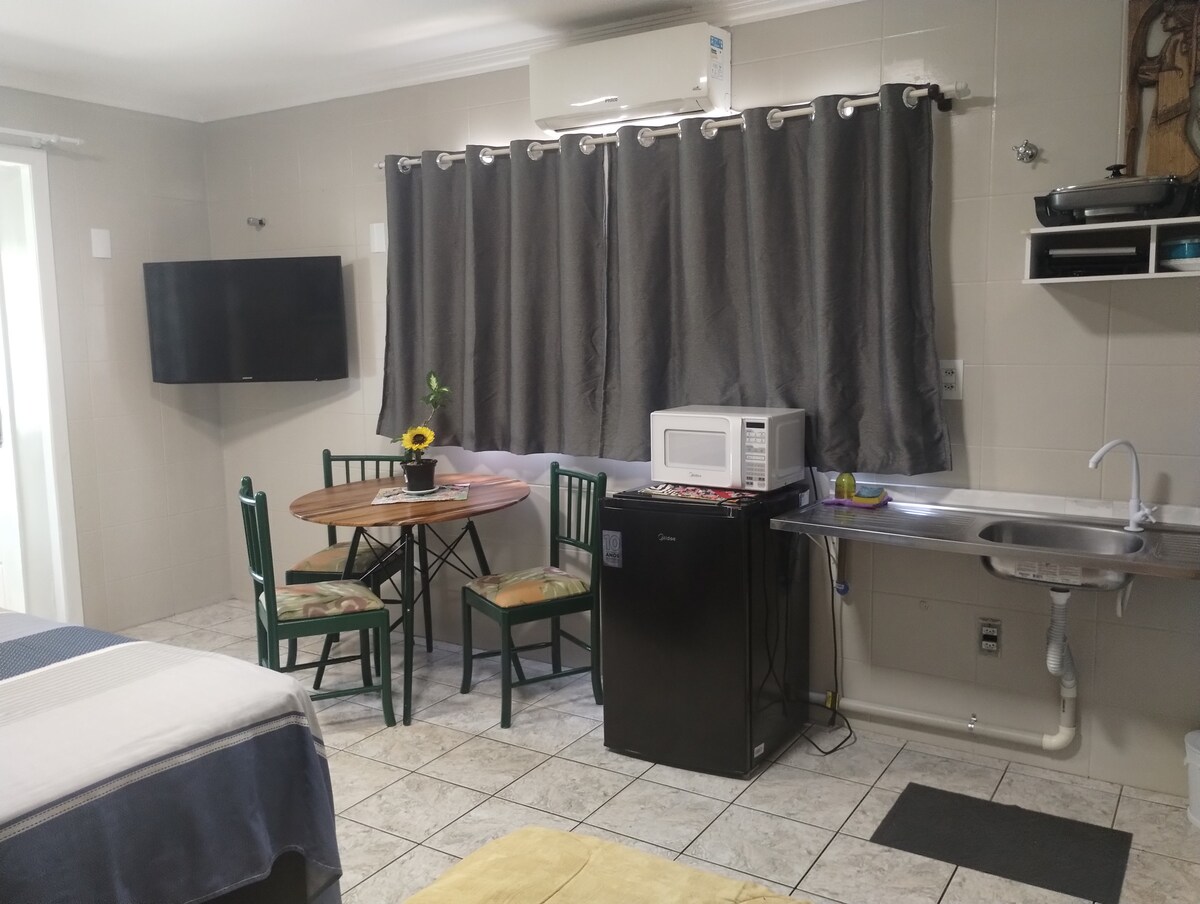 Su familia estará cerca de todo al quedarse en este lugar cálido, seguro y bien ubicado. Estudio en el centro de Foz do Iguaçu, cerca de los principales puntos turísticos, panaderías, centro comercial, supermercado y restaurantes. Habitación para hasta 7 personas con: - 2 camas dobles - 1 sofá cama - 1 colchón extra - Mesa y banquillos - Wi-Fi - TV con Chrome Cast - Aire acondicionado - Baño privado Cocina con: fregadero, nevera, cocina, microondas y vajilla. Estacionamiento gratuito.