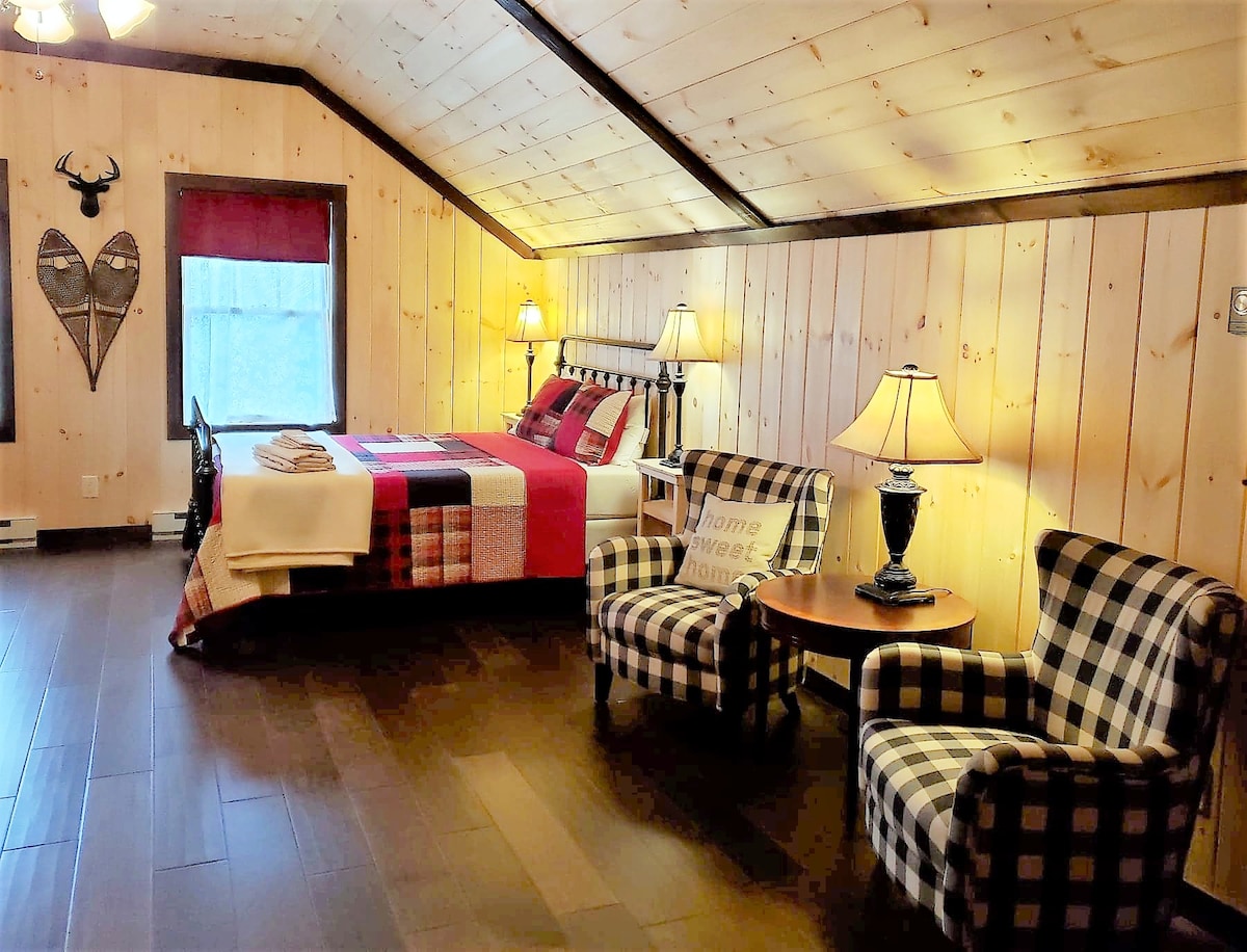 Espacio para dos, la habitación Moose es luminosa y espaciosa con techos de catedral. La suite está ubicada en Kiwassa Lake Inn, donde disfrutarás de este idílico entorno frente al mar. Los huéspedes pueden alquilar una canoa o kayak al posadero o simplemente relajarse en el muelle en una silla Adirondack. El café se proporciona en la cocina para huéspedes al que tendrás acceso durante tu estadía.