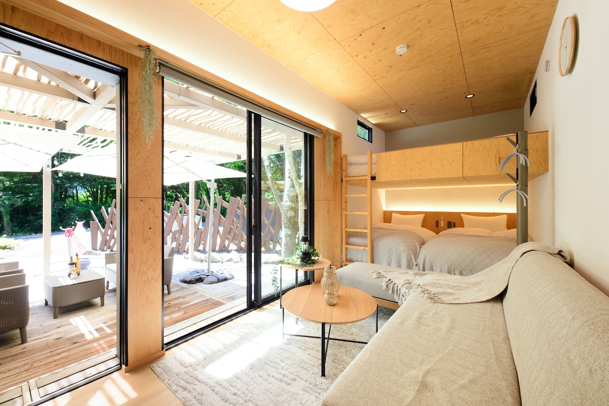 Junto al lago Ashi, THE GUEST VILLAGE Hakone Ashinoko ofrece una estancia privada que combina naturaleza y confort. Una sola casa remolque en una propiedad de 1000 ㎡ con capacidad para 5 huéspedes. Disfruta de una barbacoa en una parrilla Weber, un desayuno recién hecho en un coche cocina, un horno para pizzas, una fogata y la observación de las estrellas. El remolque incluye literas/sofás cama, aire acondicionado y wifi. El personal (excepto a altas horas de la noche) ayuda a cortar leña y a hacer pizzas. Disfruta de la comodidad y la naturaleza en una estancia única.
