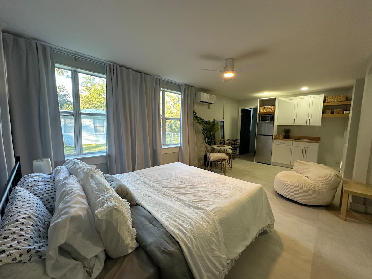 RECIENTEMENTE RENOVADO: disfruta de tu estancia en Gainesville en este moderno estudio de mediados de siglo a 0,5 millas de UF y a 2 millas de los hospitales UF y HCA. No se pasó por alto ningún detalle en esta casa de huéspedes independiente bellamente diseñada con abundante luz natural, acabados exclusivos y un sinfín de comodidades: cocina pequeña, mininevera/congelador, TV inteligente y mucho más. Este espacio privado y tranquilo convenientemente ubicado en el corazón de Gainesville es perfecto para cualquier persona que visite por solo una noche o unas semanas.