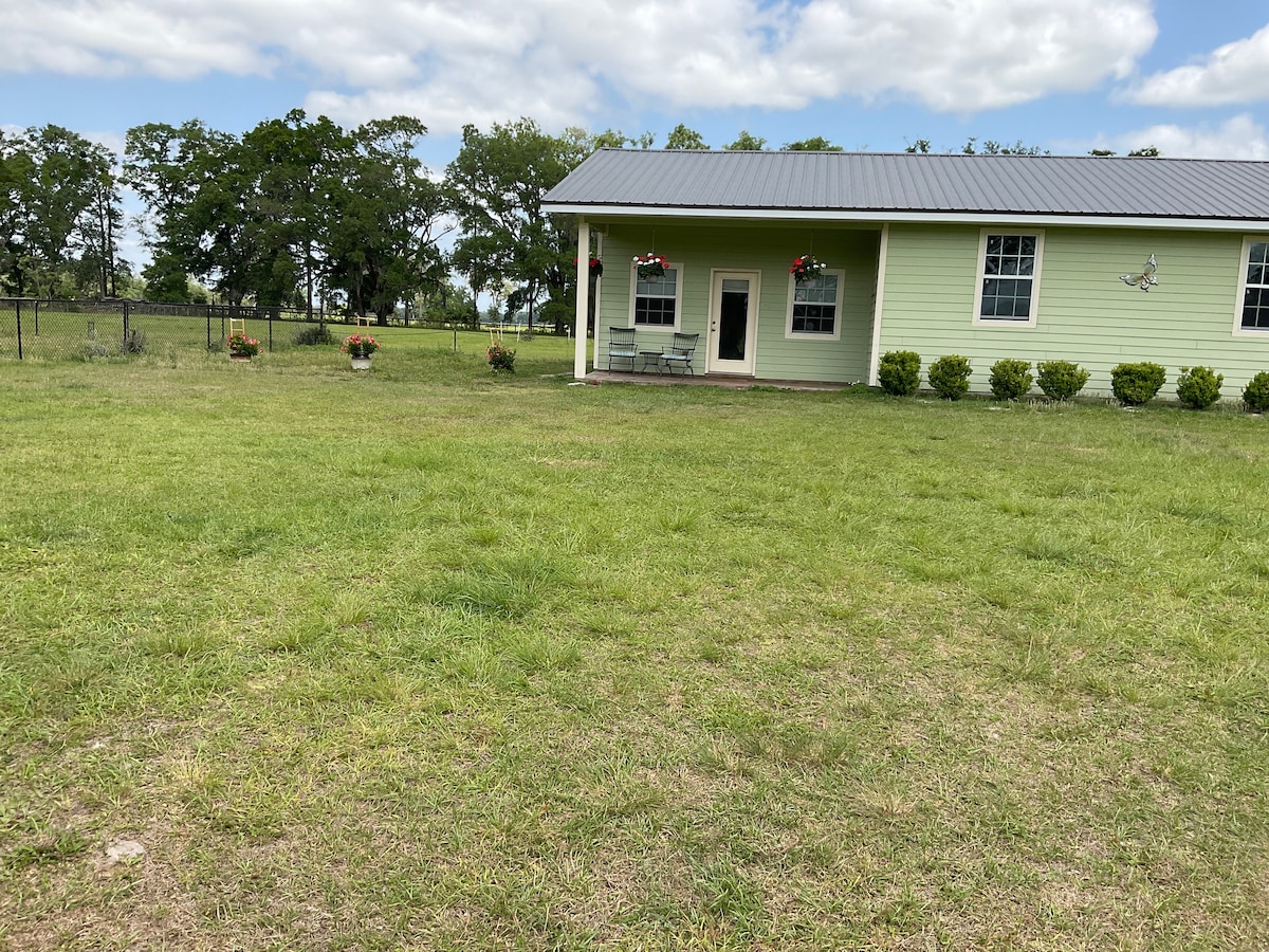Lindo, acogedor, recién remodelado, casa de huéspedes privada en una hermosa granja de 5 acres. Disfruta de tu propio jardín de hierbas en el patio trasero con valla de privacidad, mesa de picnic y chimenea. Cocina nueva con estufa de gas, microondas, horno tostador, cafetera y comedor perfecta para disfrutar de las comidas. El dormitorio está equipado con TV inteligente, cama tamaño queen y mantas adicionales. Esta escapada al campo se encuentra cerca de la Universidad de Florida (12 millas), Blue Springs (21 millas) Ginnie Springs (24 millas) y la histórica High Springs (15 millas).