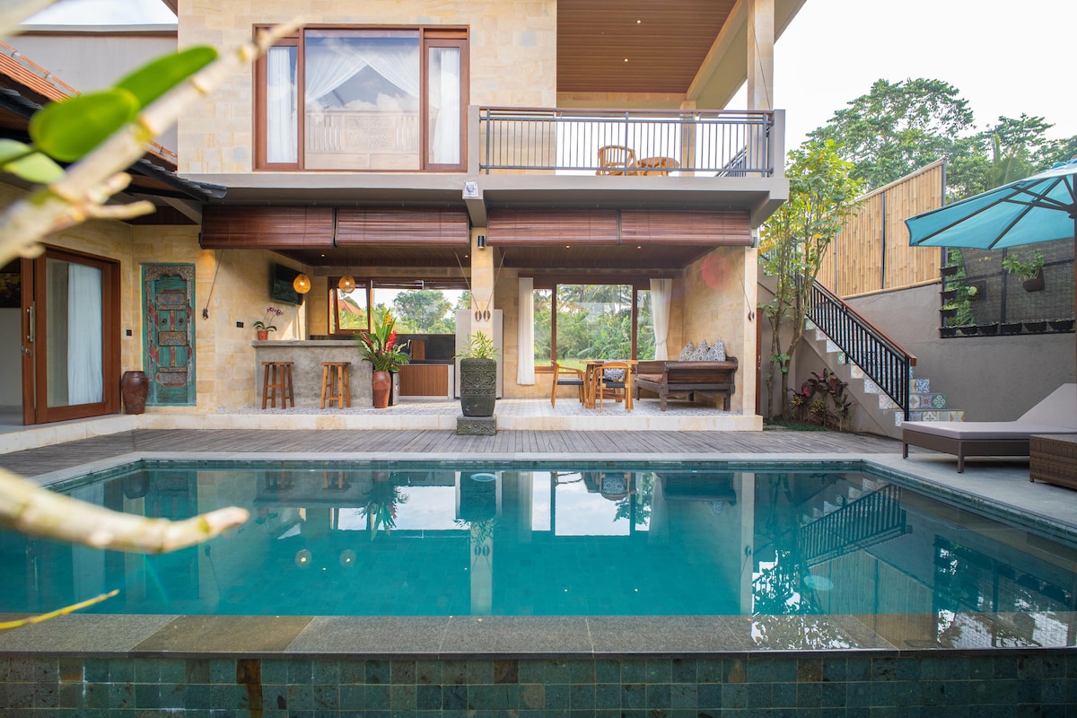 CASA PRIVADA ENTERA, con piscina privada, 2 suites serenas y espaciosas, rodeadas de exuberantes campos de arroz verdes y vistas a la jungla. A solo 3 minutos desde el centro de Ubud, pero se siente como a kilómetros de distancia. Un mundo lejos del ajetreo de la vida cotidiana. TEN EN CUENTA QUE se puede llegar a 15 minutos a pie o a 3 minutos en moto desde el corazón de Ubud (LA ÚLTIMA PARTE DEL CAMINO SOLO ES ACCESIBLE A PIE O MOTOCICLETA).