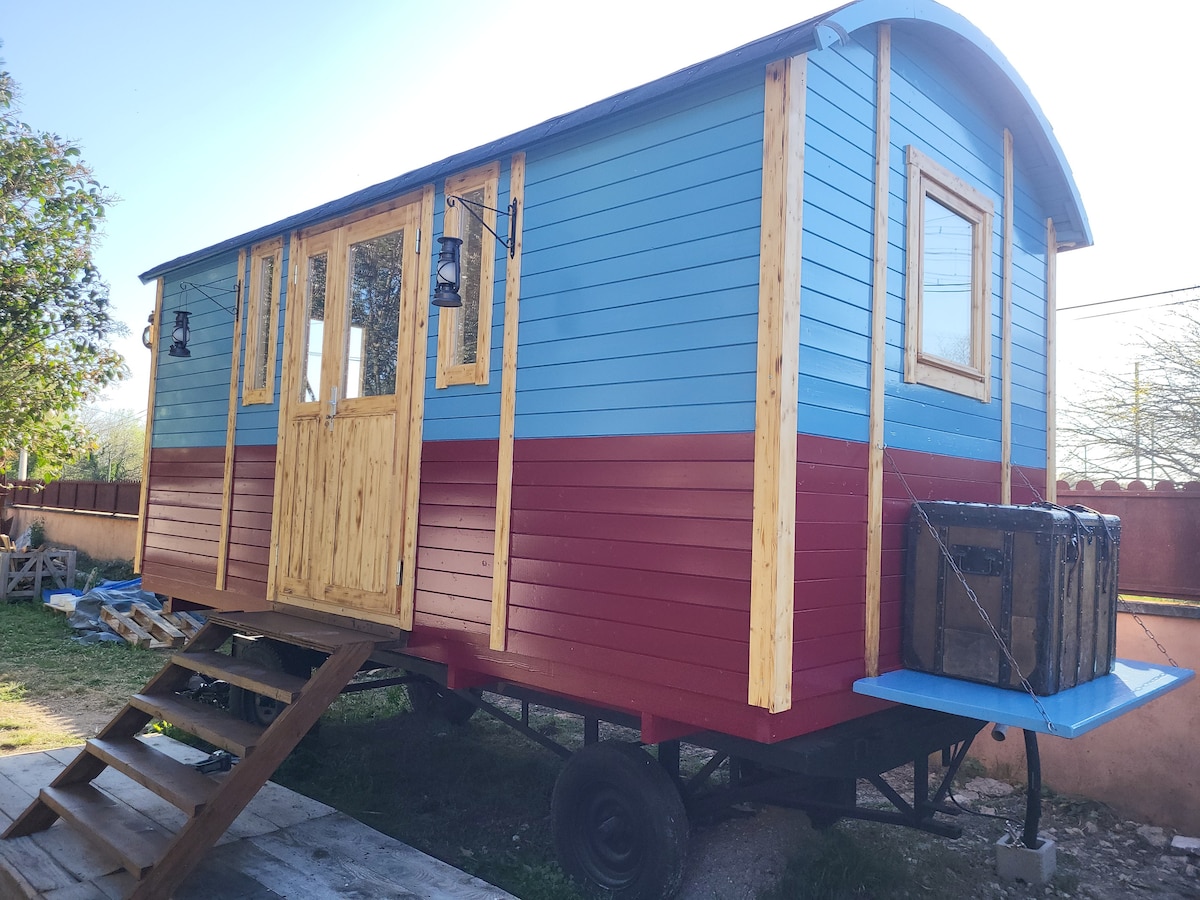 Ubicado en un adorable huerto bucólico remolque, alojamiento inusual cualquier comodidad esquina cocina pequeño cuarto de baño con ducha y WC ideal para un fin de semana en el amor una escapada elegante y bohemia.