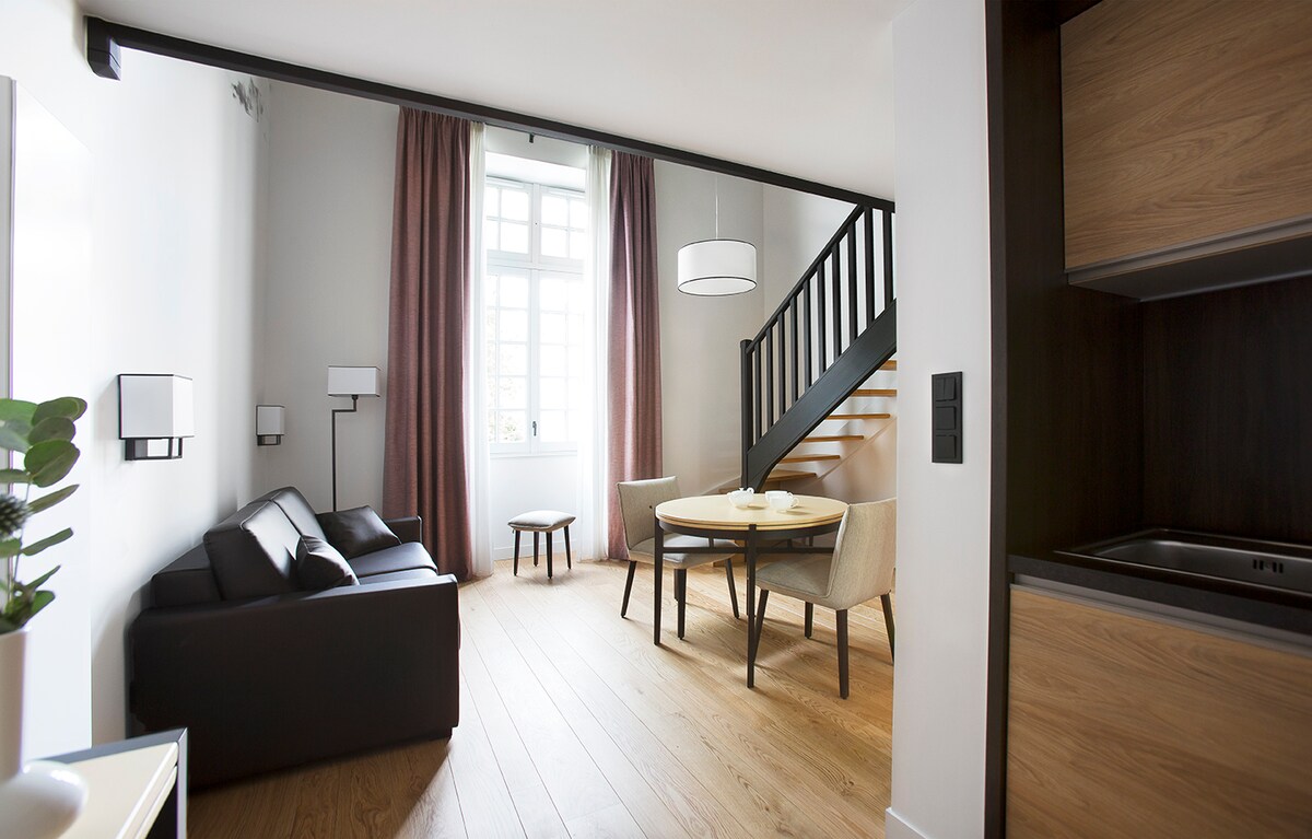 Descubra el apartamento Privilège, amplio espacio de 72 m² para 4 personas (hasta 6 con suplemento). Tiene 2 dormitorios, una sala de estar, una cocina equipada y un baño con ducha a ras de suelo. Ofrece vistas al patio y a la calle Nacional. Disfruta de una cama king size, 2 camas individuales, TV de pantalla plana, wifi y aire acondicionado. Se proporcionan ropa de cama de alta gama, albornoces y ropa de cama. Venga a alojarse en este remanso de paz glamoroso, elegante y de alta gama.