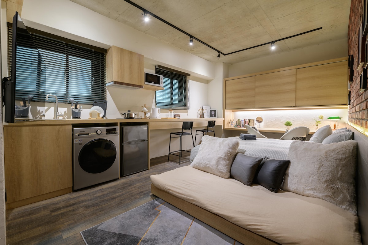 Estudio renovado a solo 2 minutos de Guting MRT. Capacidad para 4 personas con una cómoda cama de 1,5 m y un sofá cama extensible. Enorme ventana con impresionantes vistas a la ciudad de Taipéi, perfecta para trabajar con té o relajarse con vino. Smart TV con Netflix. Camina hasta el mercado nocturno de Shida, cafeterías, restaurantes, un encantador parque y supermercados abiertos las 24 horas, como 7-11, FamilyMart y PX Mart, a solo 2 minutos. Luminoso, acogedor y ultracómodo, ideal para parejas, amigos o trabajadores remotos. Abierto para estancias cortas y largas.
