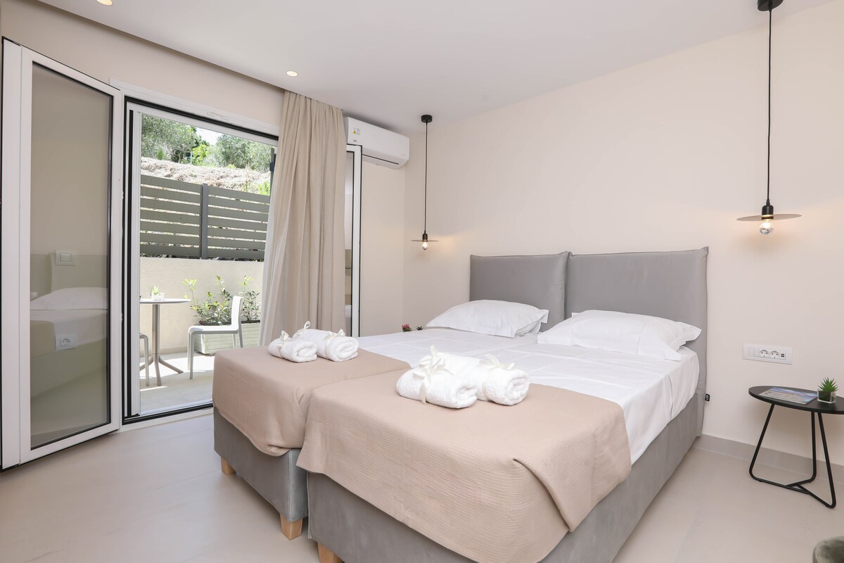 Te damos la bienvenida a Olive Green Suites en Sidari, norte de Corfú ¡Disfruta de un lujo inigualable en Sidari, norte de Corfú! Nuestros tres departamentos ecológicos de nueva construcción establecen un nuevo estándar con sus diseños únicos y minimalistas, materiales de alta gama y servicios superiores. Cada unidad cuenta con lujosos baños, cocinas gourmet y patios privados, perfectamente ubicados cerca de las playas más famosas de Corfú. Descubre la mejor experiencia de alojamiento en la que ningún competidor se acerca.