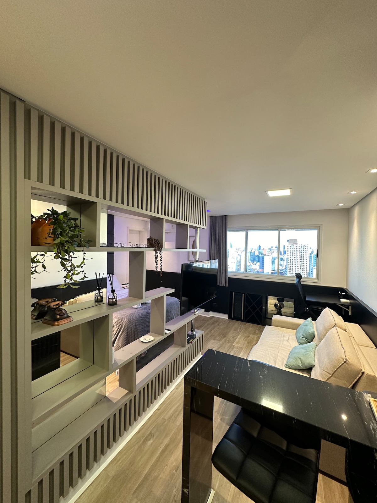 Estudio moderno, nuevo, acogedor, ubicación perfecta, con una hermosa vista desde el balcón, especialmente por la noche. Wifi rápido, escritorio, TV inteligente de 55”, cama Queen. Aire acondicionado (frío/calor). Lavadora y secadora y una hermosa isla en la cocina. 50m2 de mucho estilo-27ºandar, Silencioso. En el Centro/Batel, cerca de comercios, bancos, centros comerciales, polo gastronómico y Hospital. En el edificio: piscina, gimnasio, sala de juegos, sauna, jacuzzi, conserjería las 24 horas.