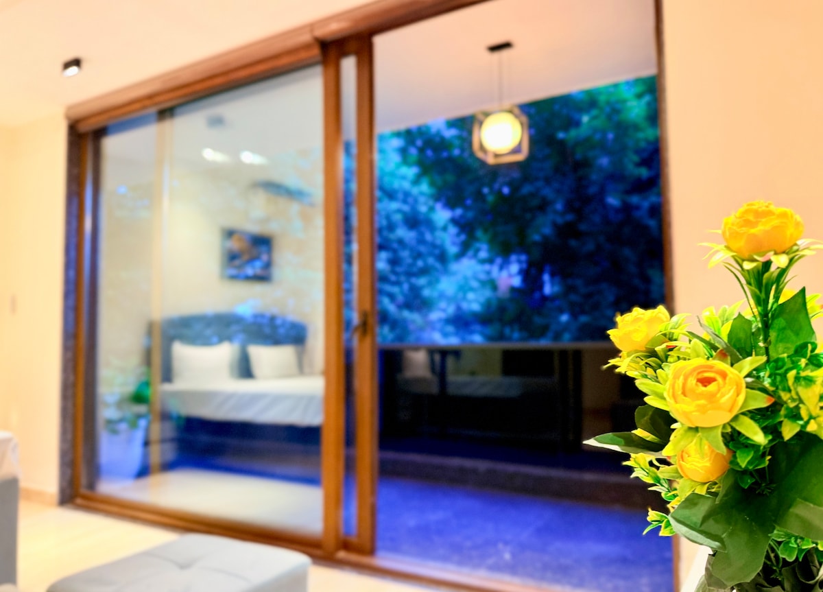 Un lugar de lujo con una gran piscina cubierta (de 10 pies por 24 pies de largo y 4 pies de profundidad) y áreas de estar decoradas con estilo. Un gran dormitorio principal con jacuzzi privado en el baño privado. Ubicado convenientemente en Posh South Delhi Neighborhood. Cerca de las principales atracciones turísticas como el Templo Lotus, Qutub Minar, Hauz Khas. Centros comerciales como, Select City Mall, GK, Shahpur jat. A 5 minutos de la estación de metro. insta - micassohomes A 30-40 minutos del aeropuerto en Uber, también accesible en metro.