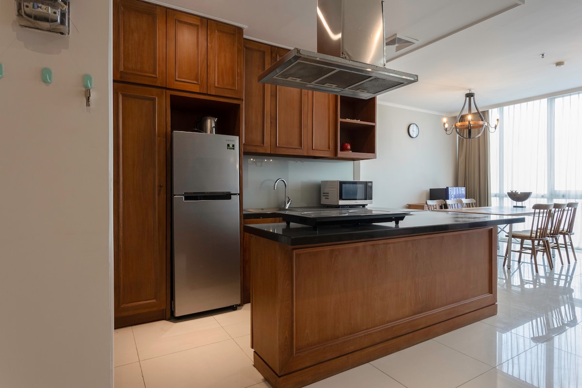 Este apartamento de 2 dormitorios (100 metros cuadrados) se encuentra en el centro de Surabaya. Lo que hace que moverse tanto por el este como por el oeste de Surabaya sea muy cómodo. Situado en la parte superior del centro comercial Ciputra World, a segundos de Starbucks, IKEA, Hypermart y mucho más. Ascensor que te conecta directamente con el centro comercial. También ofrece instalaciones en el séptimo piso que incluyen un gran gimnasio, piscina, sauna y jacuzzi. La sala de estar está equipada con una mesa de comedor para 6 personas (silla alta y esterilizador de botellas disponibles bajo petición).