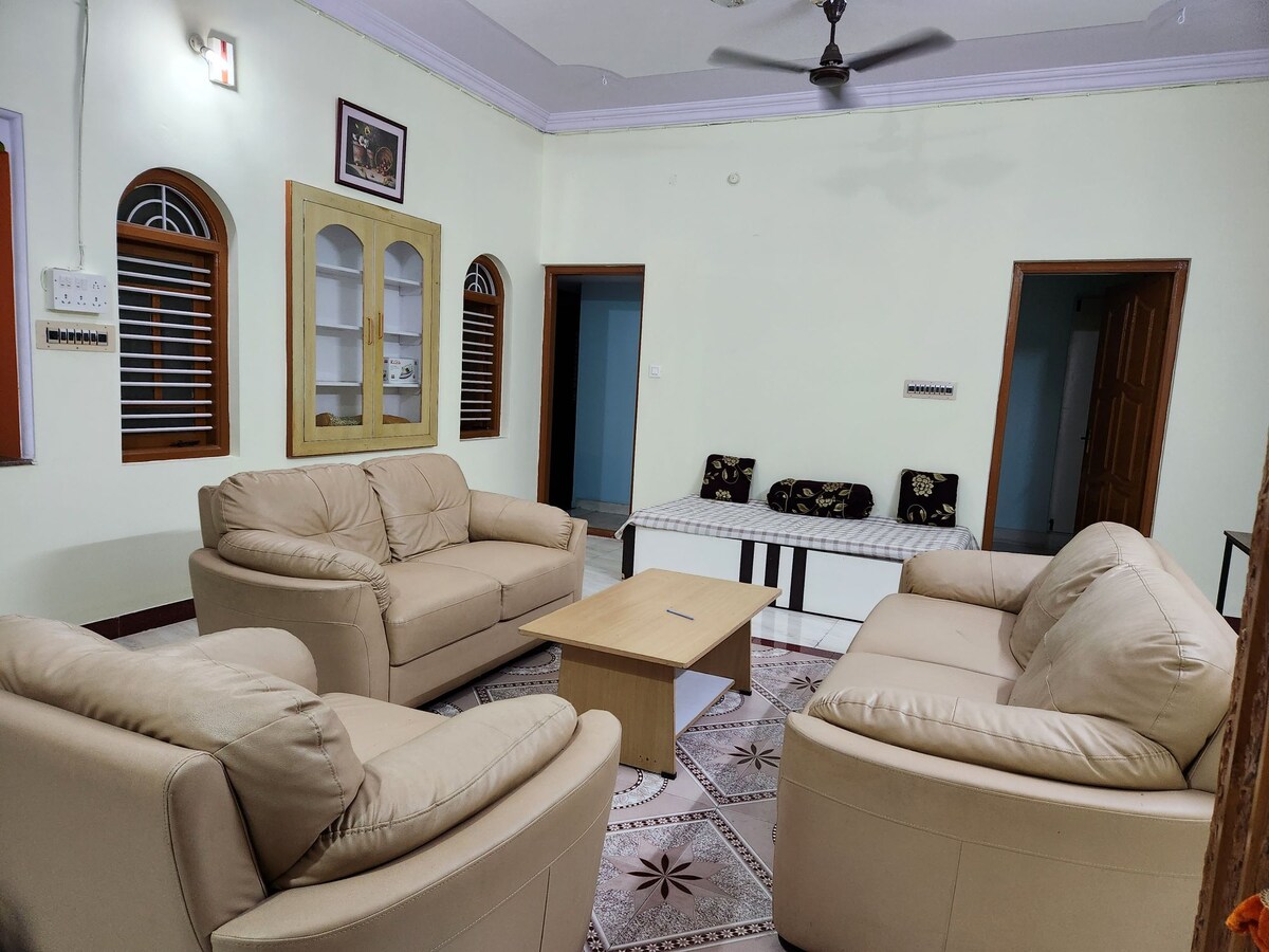 Esta casa espaciosa, limpia y amueblada con buen gusto en el primer piso ofrece una base cómoda y conveniente para ver Mysore. Tiene una cama tamaño king en el dormitorio con aire acondicionado y baño/inodoro adjunto, comedor y cocina. El salón tiene TV inteligente, sofá + una cama individual y terraza privada en la azotea. La velocidad del wifi es de 100 mbps. Hay aparcamiento en la calle delante de nuestra casa.