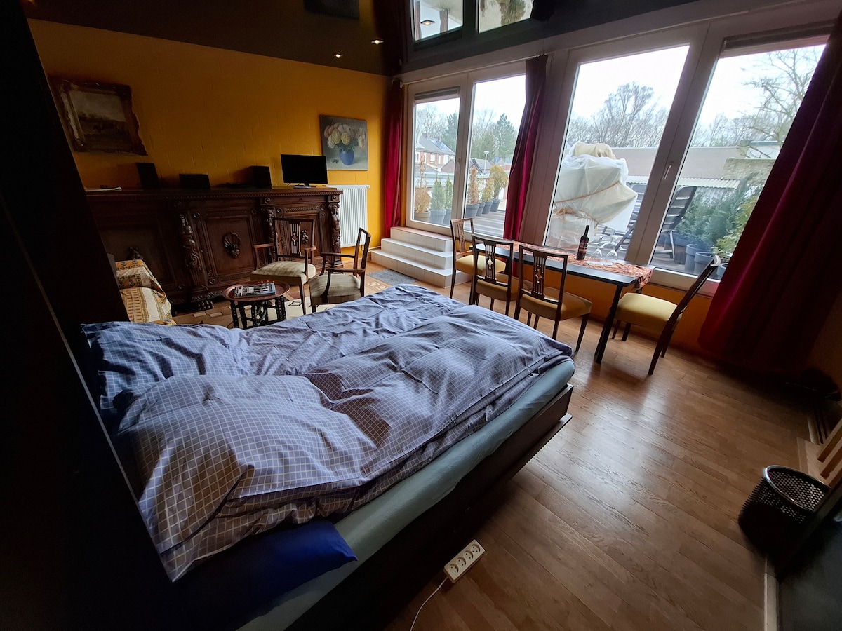 Fantástico departamento tipo estudio con entrada privada y terraza en la azotea - Estacionamiento gratuito y parada de autobús frente al edificio - A 10 minutos de la estación de tren - A 7 minutos en auto de la frontera - A 40 minutos del centro de la ciudad de Eindhoven El estudio tiene entrada independiente. La planta baja consta de un baño, un aseo y una cocina. En el piso de arriba, hay una sala/dormitorio grande con un sofá cama, dos sillas, una mesa, un ropero, un televisor inteligente con wifi y una terraza en la azotea para fumadores. NO SE admiten perros.