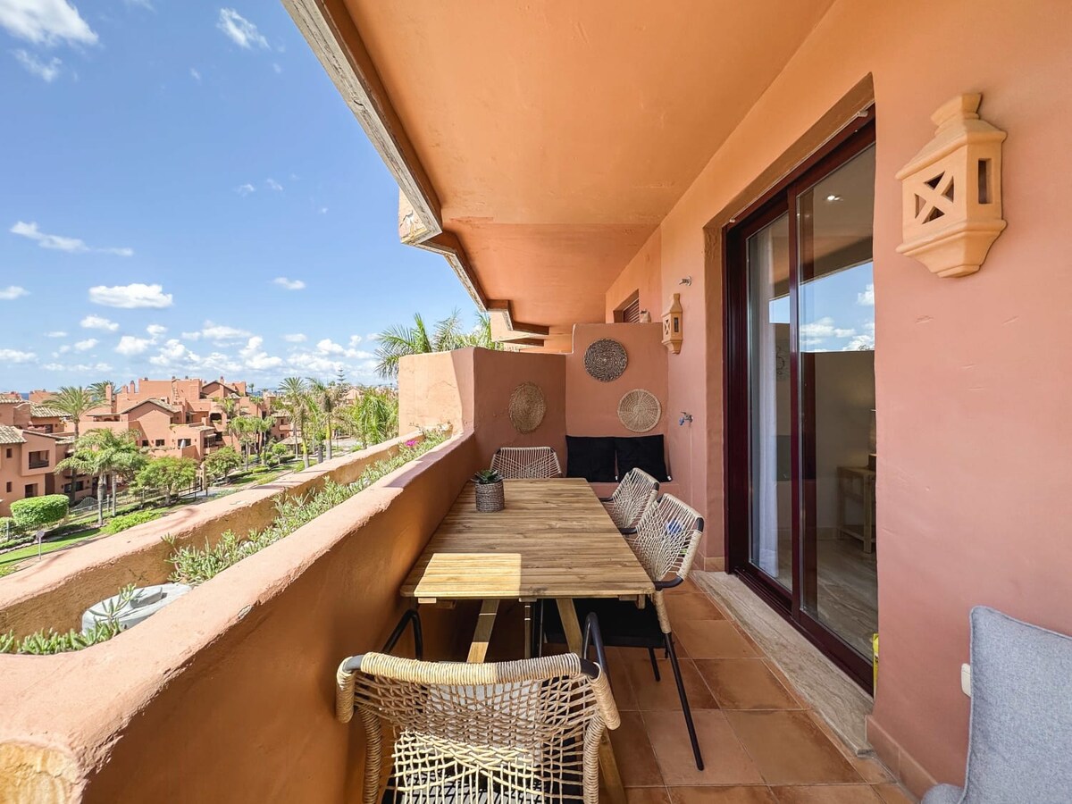 Moderno y elegante apartamento entre Banús y Estepona, en la Nueva Milla de Oro. Luminoso salón, cocina completa, 2 dormitorios + sofá cama (hasta 5 huéspedes). Terraza privada con vistas al mar, barbacoa compartida, jardín, cerca de playa y restaurantes. ¡Escapada ideal en la Costa del Sol!