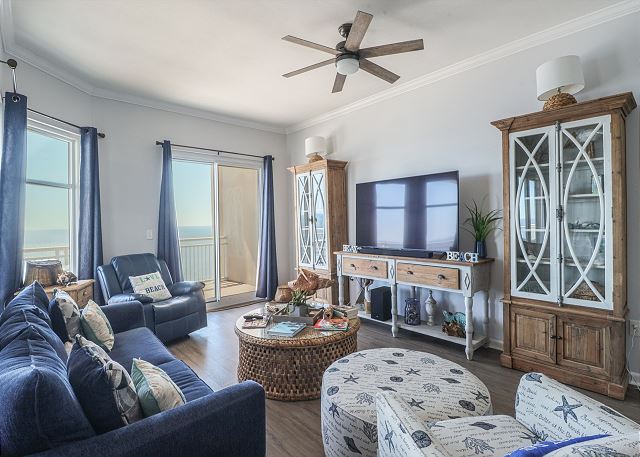 Apartamento de 2 dormitorios y 2 baños en el octavo piso que se encuentra directamente en la playa de Seabreeze. Relájate en tu balcón privado con vistas a la hermosa costa del golfo. Televisores de pantalla plana, cable, wifi en todas partes. Dormitorio principal con cama tamaño king, ventanales del suelo al techo con vistas increíbles al golfo y baño en suite con bañera de hidromasaje grande. Segundo dormitorio con cama tamaño queen y baño en suite. Cocina totalmente equipada, comedor y lavadora/secadora de tamaño completo. Servicios de Seabreeze: 2 piscinas junto a la playa, gimnasio, sauna y zona de barbacoa.