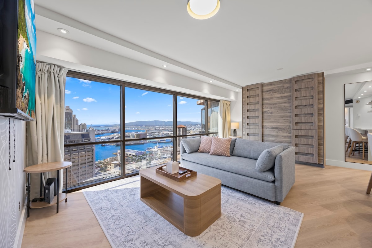 Disfruta de impresionantes vistas del atardecer, el océano, la montaña y la ciudad desde este espacioso condominio de 1 dormitorio en el piso alto con ventanas del piso al techo. Ahorra $ 40 por noche con estacionamiento seguro y gratuito en el edificio, además de wifi gratuito y cocina totalmente equipada. Camina hasta los mejores restaurantes y bares, ciudad china, y visita el histórico Palacio Iolani. El edificio cuenta con excelentes comodidades que incluyen una piscina de entrenamiento y una bañera de hidromasaje los 7 días de la semana, seguridad las 24 horas. Starbucks/711/Paris Baguette/UPS en la planta baja para tus necesidades diarias.
