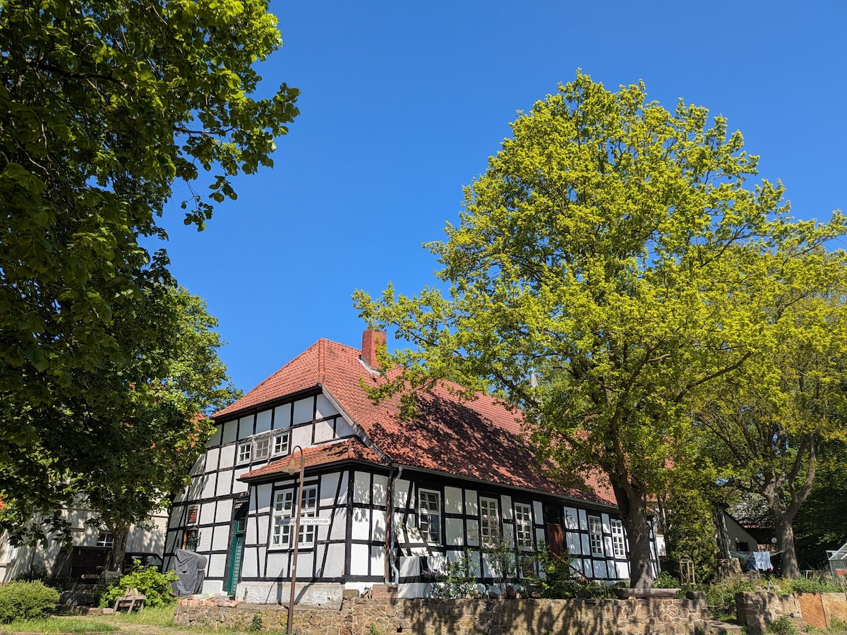 Du bewohnst ein Haus in einem denkmalgeschützten Fachwerkensemble von 1774 in direkter Umgebung von Detmold, ausgestattet mit Antiquitäten, Kinosaal, Gartenlaube mit freiem Blick auf den Teutoburger Wald. Komplette Küche, Infrarotsauna, gemütliche Stube mit Ofen- und Elektroheizung. Schlafzimmer mit Lehmwänden, ein zweites unter dem Dach. Garten vor dem Haus zur alleinigen Nutzung zum Grillen, Spielen usw. Kinder und Haustiere willkommen. Supermarkt 1,1 km, City 3,5km entfernt. Brennholz incl.