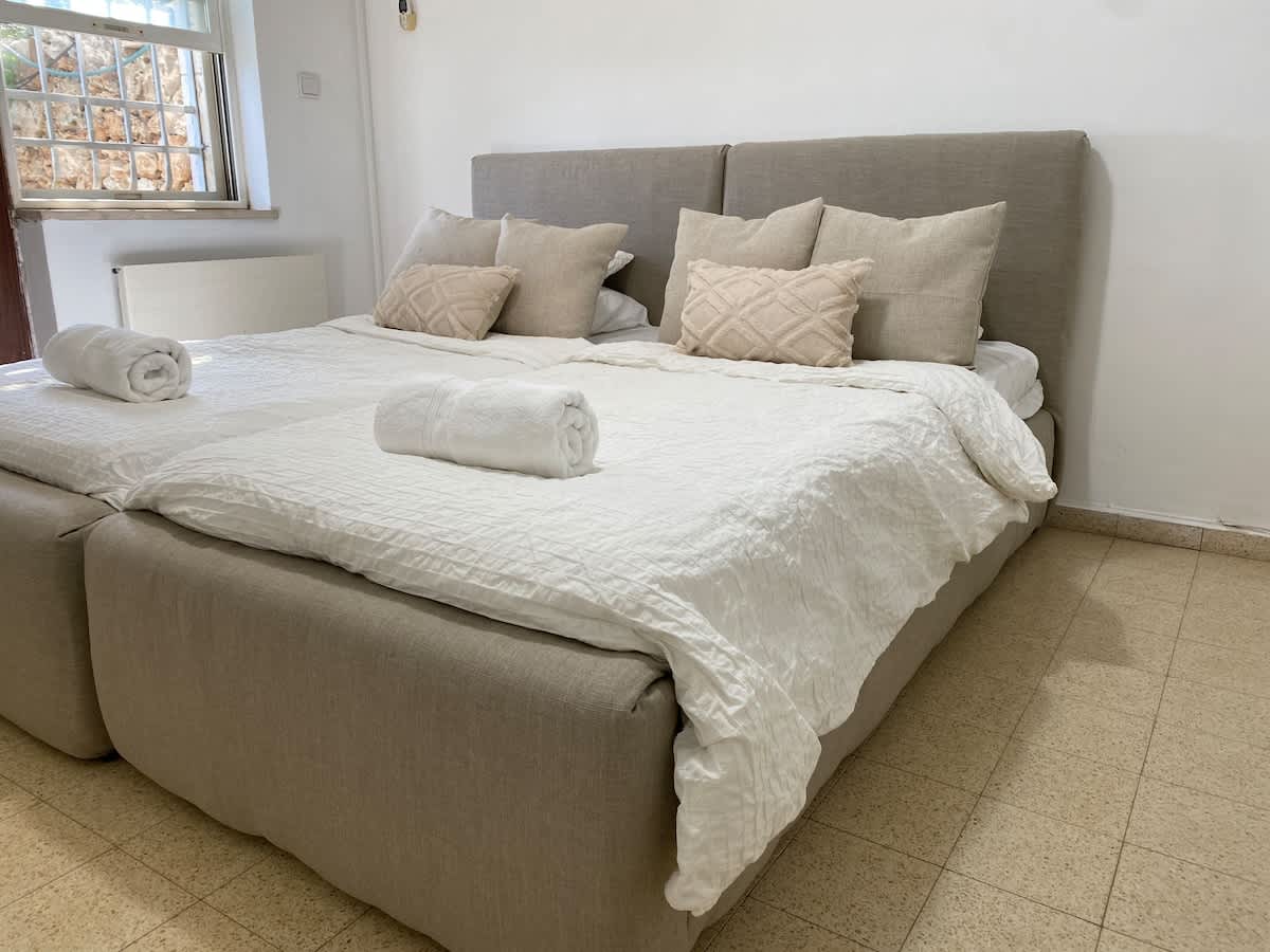 Nuestro alojamiento combina espacio, elegancia y calidad. Disfruta de una cocina de nivel Michelin, un amplio jardín y un salón con un escaparate con vistas al bosque y a las colinas de Jerusalén. Relájate en cómodos sofás, trabaja en una oficina tranquila y mantente conectado con internet de alta velocidad y fiable. Termina el día en el jacuzzi, rodeado de calma y belleza: una mezcla perfecta de comodidad y estilo.
