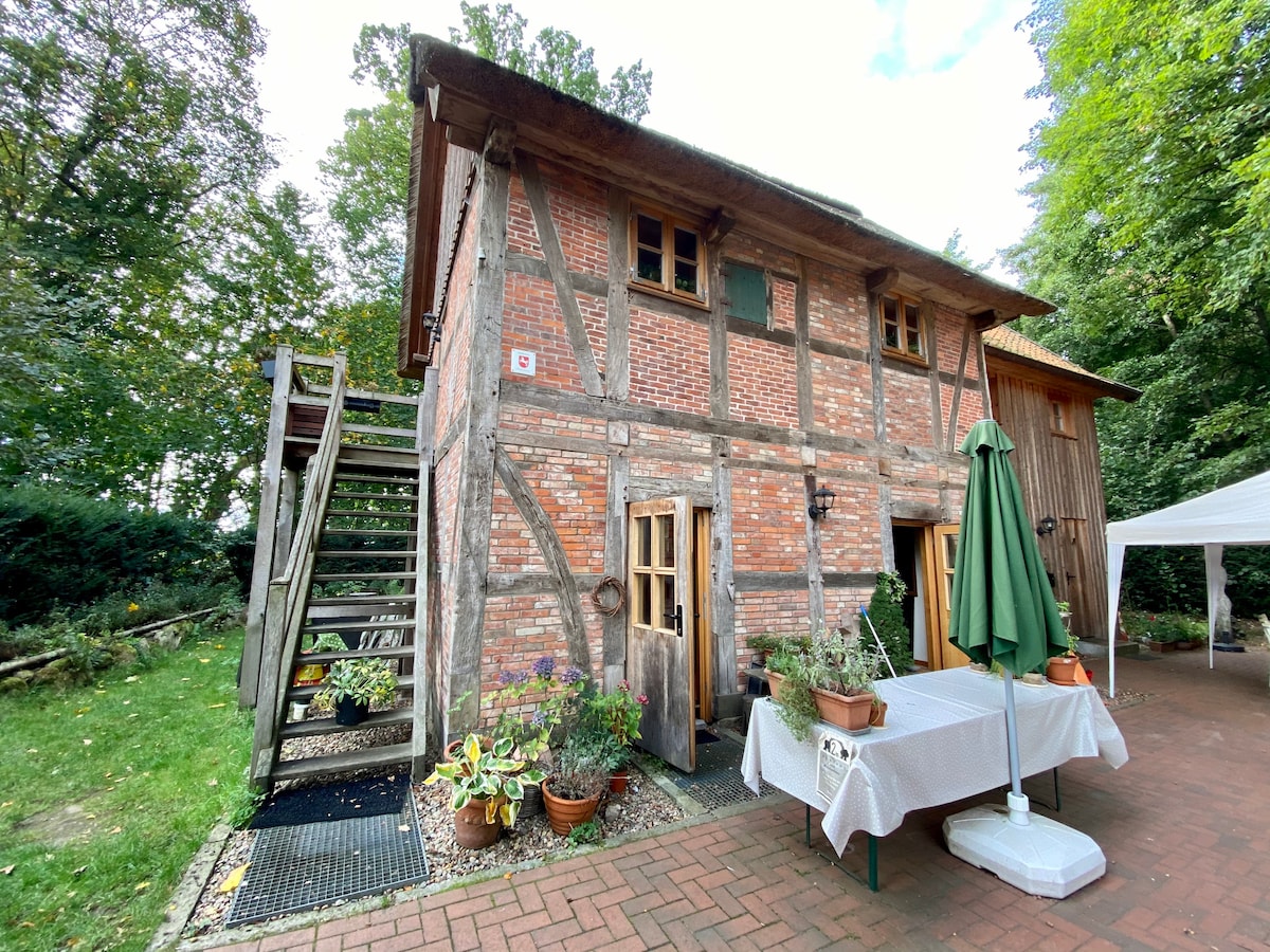 La casa de vacaciones es una antigua cochera construida en un estilo de entramado de madera y se encuentra en una propiedad de 3000 metros cuadrados junto con la casa del propietario en un asentamiento forestal tranquilo a una distancia de unos 300 m de la Bundesstraße 3. Está diseñado para 2 personas y no se permiten mascotas. Se proporcionan sábanas y toallas. La ubicación es ideal para excursiones de senderismo y ciclismo en Lüneburg Heath.