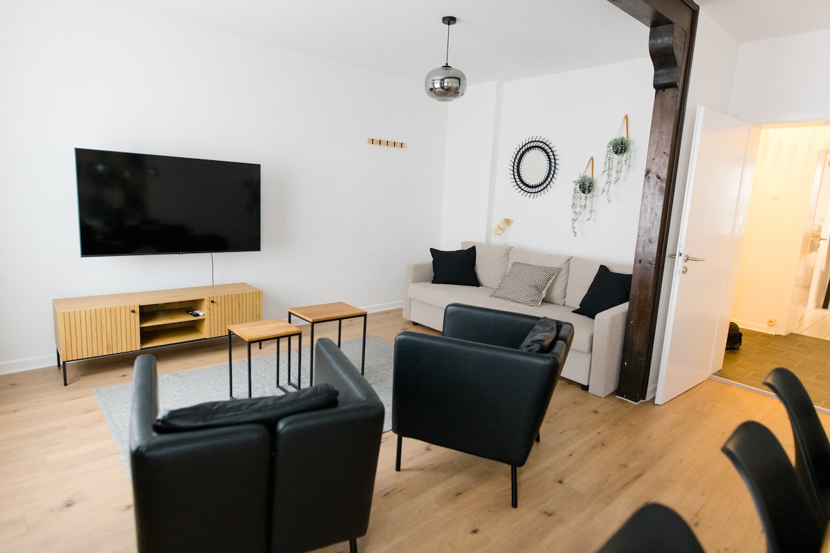 ¡Te damos la bienvenida a BRIGHT en el centro de Hildesheim! ¡Disfruta de lo mejor de Hildesheim en nuestro apartamento de diseño moderno en un edificio antiguo con una ubicación perfecta! Descubre nuestro apartamento de 80 m² y 3 habitaciones que ofrece todo lo necesario para una estancia inolvidable: → Camas dobles tamaño king para noches de descanso → Un televisor inteligente con varias aplicaciones para entretener por las noches → Una cafetera Nespresso para tu patada de cafeína por la mañana → Una zona de cocina totalmente equipada → Plaza de estacionamiento justo detrás de la casa