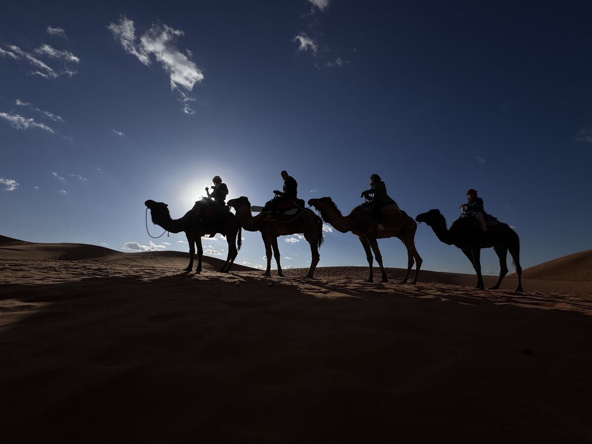 we shall meet in the meeting point where you will park your car. You will be then pick up by 4x4 to start your camel ride. You will stop in the middle of the dunes to watch the sunset and then you will continue to the camp. In the camp, you will be welcomed with tea and berber smiles. After a delicious dinner, the joy will start with drums and berber music around the bonfire. Or simply you can have a walk under the starry night. In the morning after the breakfast, you will take camels back .