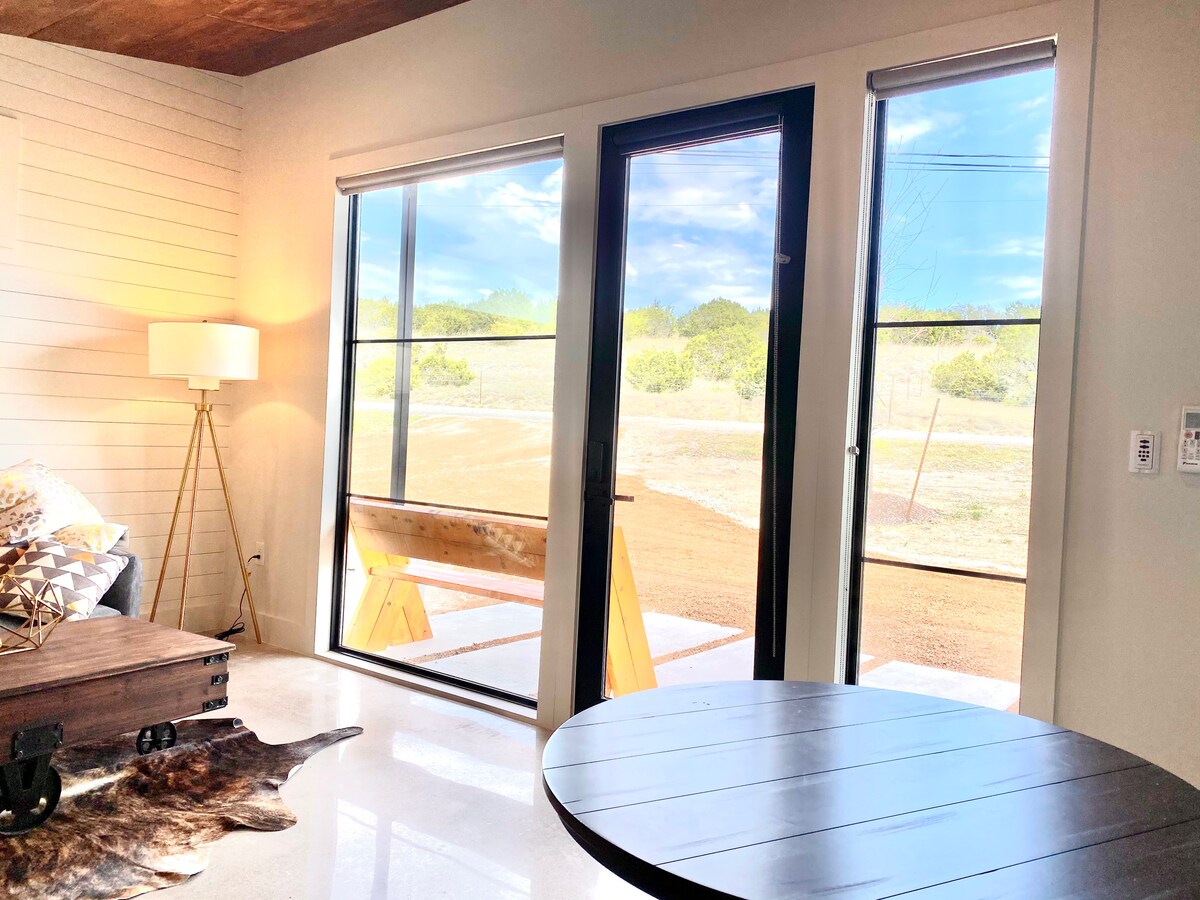 This artful rural retreat is a mix of quaint charm and modern elegance. Connect with a loved one or simply disconnect from the world. Watch the sunset or stargaze in complete privacy from the porch or hot tub that overlooks a meadow encircled with trees. Step inside to a flood of natural light. Cook a meal in the fully stocked kitchen. Get a great night's rest in the organic king-size bed. Explore nearby wineries, breweries, and hiking trails. Austin is a short drive from here too!