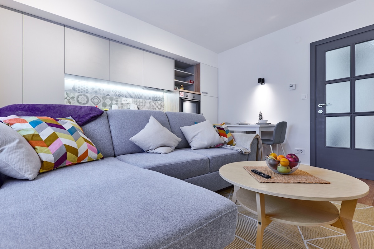 NUEVO apartamento elegante en el CENTRO DE LA CIUDAD a menos de 10 minutos a pie de la plaza principal y la estación de tren. Situado en un tranquilo patio trasero en la calle principal para que puedas disfrutar de noches tranquilas. Hay un dormitorio con cama tamaño queen, sala de estar con TV + NETFLIX y sofá cama (tamaño queen), baño con inodoro y amplia ducha separada. Todos los muebles y electrodomésticos son nuevos. Té y café GRATIS, toallas GRATIS.
