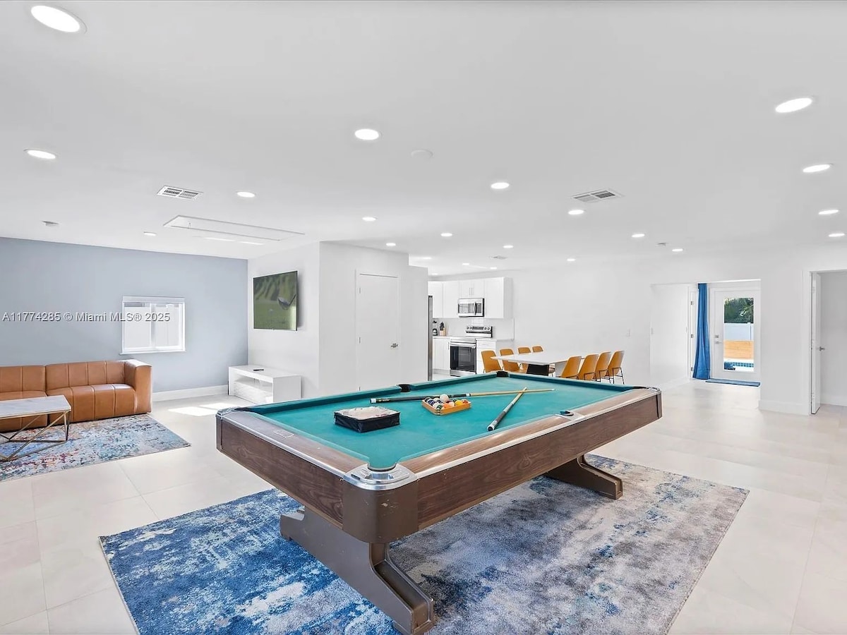¡Trae a tus amigos o familiares a esta moderna casa! Hermosa 5 dormitorios 3 baños. Casa grande: capacidad para 14 o más huéspedes. Sala de juegos que incluye mesa de billar, máquina de pinball, Mortal Kombat, Street Fighter y NBA JAM. Televisión también. Disfruta del patio al aire libre con jacuzzi y zona de estar. Nunca te aburras ,agarra un kayak o una tabla de surf de remo y camina por el canal. 8 minutos - Aeropuerto FLL. 20-25 minutos -MIA Airport o South Beach. 3-5 minutos -HardRock MERCADO DE AGRICULTORES locales a poca distancia de la casa, los sábados y domingos.