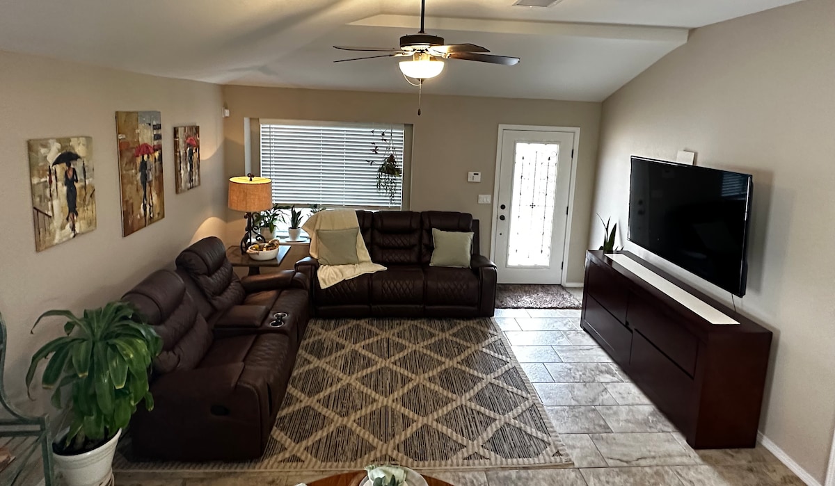 Relájate con toda la familia durante tu visita a Sun City. La casa cuenta con 4 dormitorios y 2 baños completos con un acogedor patio trasero equipado con una parrilla y asientos al aire libre. Esta casa se encuentra a 2 minutos de restaurantes locales, a 9 minutos de la i10 y a 20 minutos del aeropuerto. Este es el lugar perfecto para relajarse después de una larga jornada de trabajo o juego.