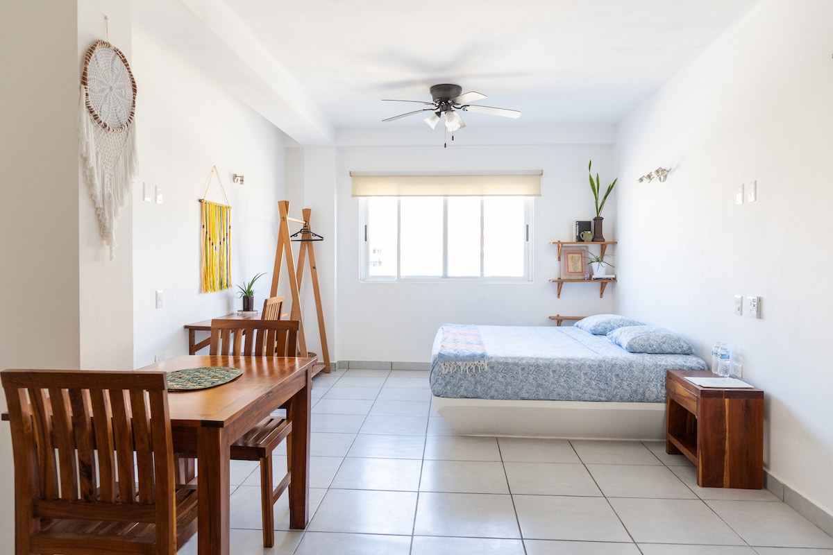 Just a 2.2. Km walk from the Puerto Juárez beach is this private studio located, ideal for getting to know the downtown area of Cancun and the quietest beaches in the area. You'll find just a steps away a local market, restaurants, coffee shops and the bus stop that will take you everywhere. - A solo 10 minutos caminando de la playa Puerto Juárez se encuentra este estudio privado, ideal para conocer la zona centro de Cancún y las playas más tranquilas de la zona.