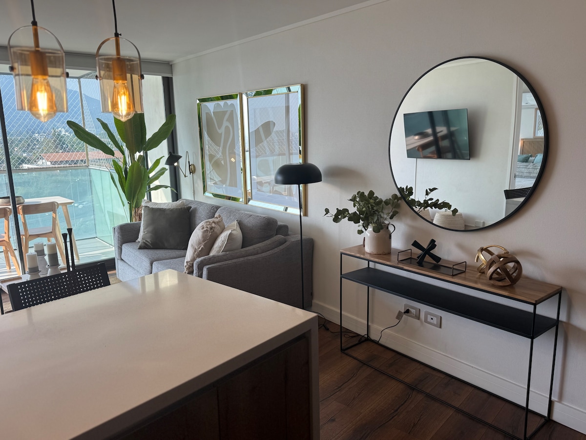 Bienvenid@ a tu refugio en Vitacura Te invitamos a disfrutar de este cómodo y luminoso departamento, ubicado en una de las zonas más lindas y seguras de Santiago. Aquí estarás a pasos del Parque Arauco, Open Kennedy, el Parque Araucano y la Clínica Alemana. El departamento está pensado para que te sientas como en casa: tiene una cocina integrada hecha en madera, completamente equipada para que puedas cocinar lo que quieras; una cama king muy cómoda y un sofa cama con topper..