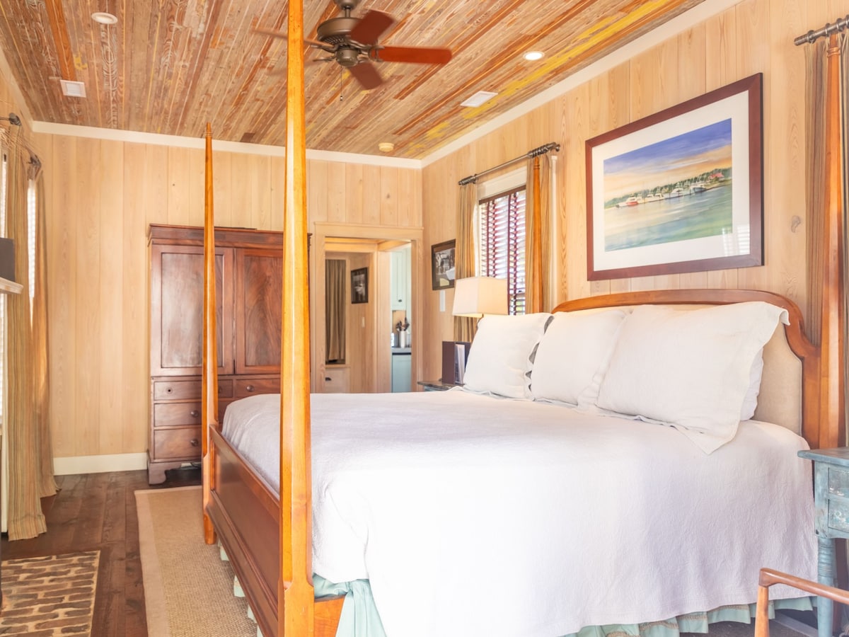 Little Pearl Cottage is a one bedroom, one bath weekend getaway part of the Southern Living Inspired Community on Boathouse Row. This cottage is furnished with a king size bed, comfortable sitting area, kitchenette and table as well as basic cable and Wi-Fi. Screened porch and shared fire-pit overlook the harborview location.