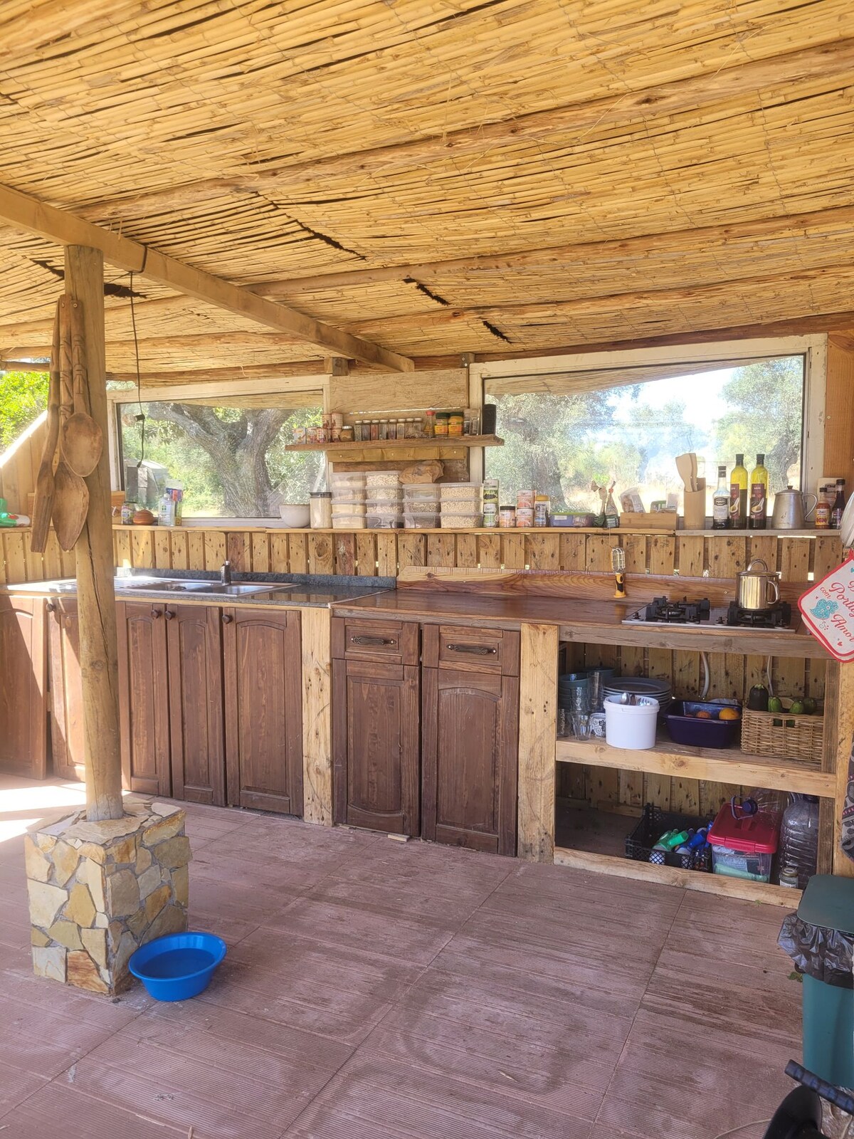 Bonita casita de madera en un hermoso glamping, Majuma Valley, de 3 hectáreas rodeada de olivos. Hay una acogedora cocina al aire libre y una hermosa plataforma en la montaña donde puedes hacer deporte, meditar, bailar o mirar las estrellas por la noche. También tenemos una piscina natural. Relájate por completo en este lugar. El baño y la cocina son compartidos. Hay 3 perros muy dulces, así que si quieres traer un perro, envía un mensaje primero.
