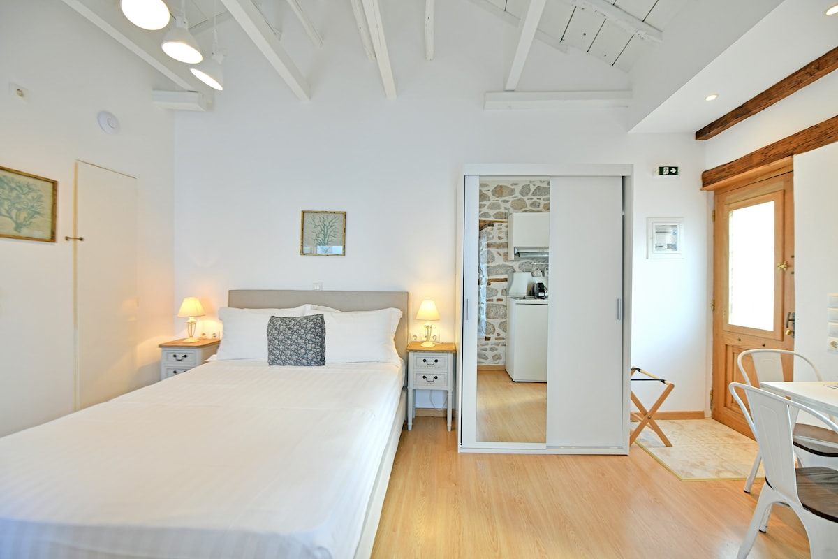 A solo 150 metros del puerto de Hydra y después de pasar el monasterio con el campanario, encontrarás nuestro alojamiento. Habitación donde te relajarás y descansarás. Consta de 2 camas individuales,pero también puede ser una cama doble con sustrato. Una pequeña cocina pequeña y un baño en suite.Bap con vistas.