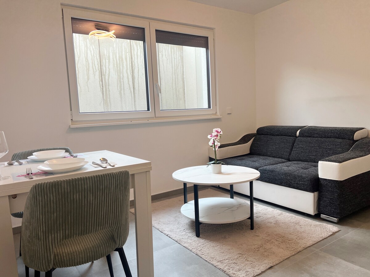 Acogedor apartamento nuevo, solo o para dos. Entrada independiente, ubicada en una calle lateral tranquila, en el centro está a 15 minutos a pie. Autobús y supermercado cerca. 50 metros cuadrados perfectamente equipados, cocina totalmente equipada, amplia ducha con ducha de efecto lluvia, duerme bien en la cama de somier de 1,8x2 m. Bonito patio. Estacionamiento frente a la puerta.