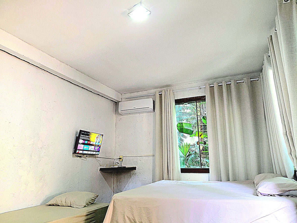 venha descansar integrado com a natureza, ideal pra família, lugar tranquilo. suíte com ar condicionado,tv, wify, 1 cama king bem confortável e espaçosa e uma cama de solteiro, temos uma piscina com espaço pra criancas, lucas extremamente tranquilo, excelente pra home office, aqui só se houve canto dos pássaros.