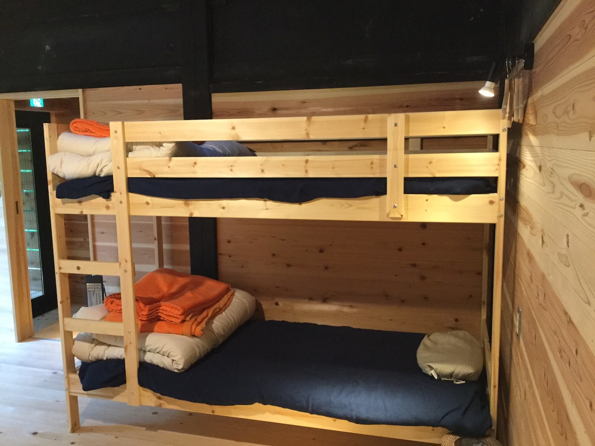 Built over 340 years ago, this renovated gassho-style house is now operated as Kazura Gassho Guesthouse. It is not a perfectly finished modern space, but one where time, wood, and daily life are still felt. The private room includes a bunk bed, two futons, a private bathroom, and a terrace. Cold drafts and creaking sounds are part of the house’s character. Staying here may feel less like a hotel, and more like life in a lived-in home.