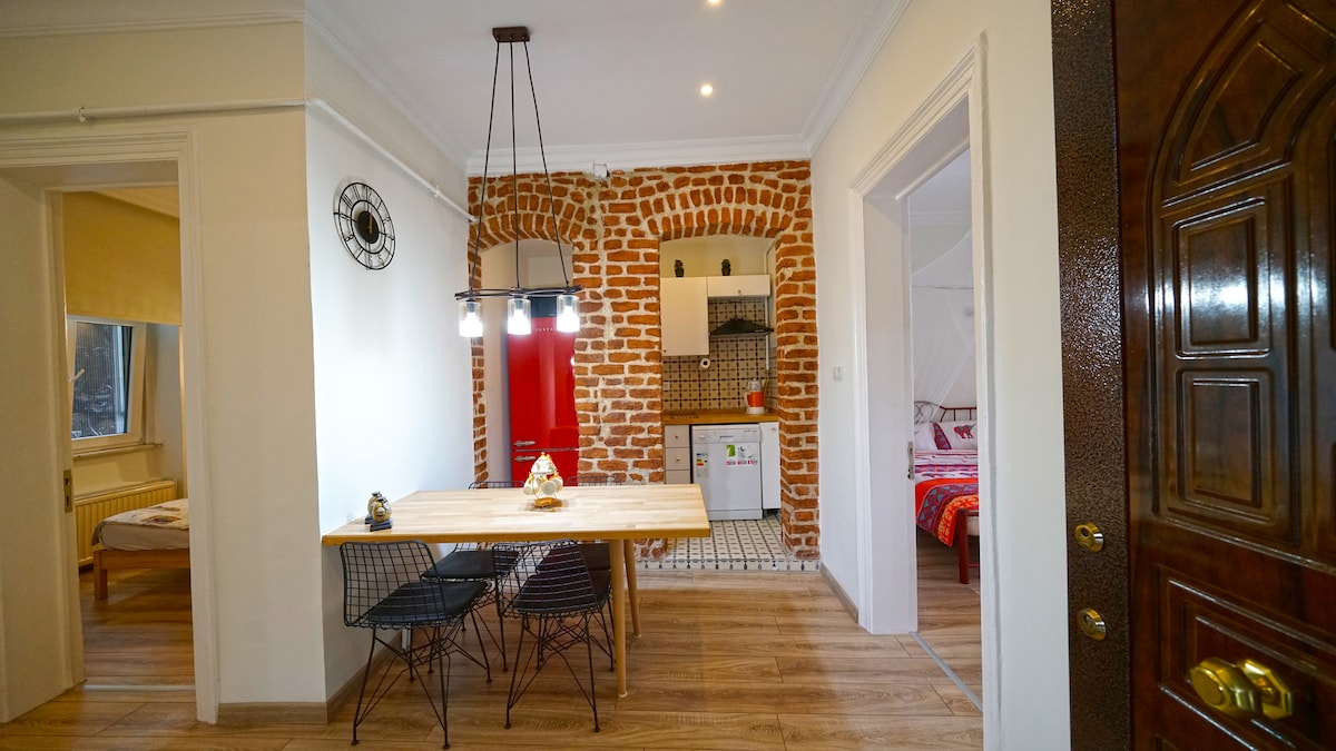 Este piso es una combinación de dos apartamentos separados que están arriba y abajo y en el primer y segundo piso. Sus puertas están en el edificio y las escaleras no están dentro. Hay 20 escalones para llegar al primer piso. Hay una bonita terraza privada con una chimenea y una bonita mesa de madera. Nuestro wifi es ilimitado y tiene una velocidad de 100 mbps. IPTV con todas las canales de televisión del mundo. A 200 m de la Torre Gálata, a 400 m de la calle İstiklal, a 400 m del metro, a 850 m de Galataport. Se coloca en el corazón de la ciudad de Gálata.