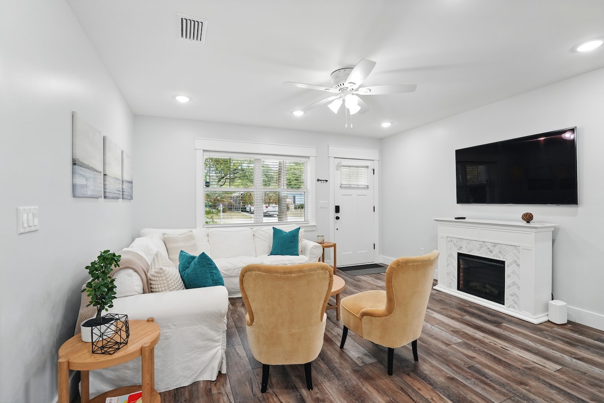 Alójate en Seven Palms Retreat en 2nd Avenue en Jacksonville Beach para una escapada tranquila. Esta casa de 2 dormitorios y 1 baño está a solo 7 manzanas de la playa, a 5 minutos en bicicleta de la arena. A poca distancia a pie de tiendas locales, parques, bolos y restaurantes. Capacidad para 6 personas con una cama tamaño queen, 2 camas individuales y un sofá cama extraíble de tamaño completo. Relájate junto a la hoguera en el patio trasero de adoquines y haz una barbacoa al aire libre. Nuestra casa completamente renovada garantiza un ambiente limpio y acogedor para tu viaje.