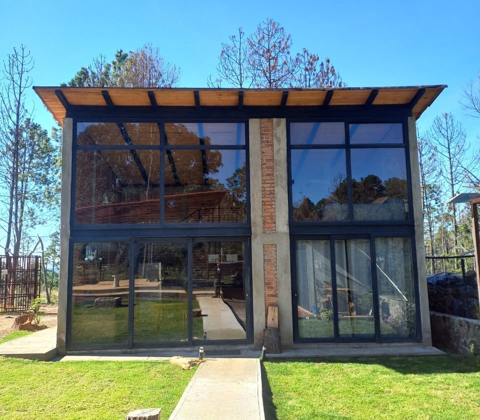 Es una cabaña amplia. Por la parte de afuera está una parrilla, una banca y baños en caso de querer hacer una rica carne asada. En la parte de abajo de la propiedad, hay un río que se puede visitar. El terreno está lleno de áreas verdes y naturaleza.