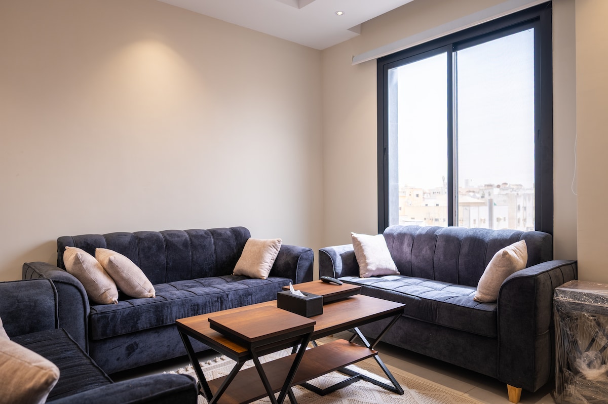 Ático de diseño moderno, ubicado en el corazón de Yeda. - El ático se encuentra a 2 minutos de Prince Sultan y a 4 minutos del centro comercial U-Walk. - Este moderno apartamento ático de diseño satisfará todas tus necesidades vacacionales. - El apartamento ofrece una habitación totalmente amueblada, sala de estar, cocina pequeña y baño. - El apartamento cuenta con lo esencial para unas vacaciones, como un televisor de 70 pulgadas, internet 5G, nevera, cafetera y mucho más.