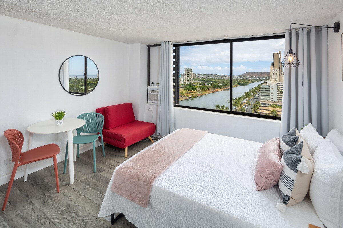 ¡Disfruta de una escapada perfecta para parejas y familias pequeñas que visitan Waikiki! ¡Vuelve a casa en este hermoso estudio ESQUINERO de 1 baño con lanai privado que cuenta con el plano de estudio MÁS GRANDE dentro de Luana Waikiki sin las tarifas adicionales del centro vacacional! ¡Salida fácil y sin complicaciones (sin tareas que hacer)! Situado en el paseo marítimo de Kalakaua Ave, a pocos pasos de Luxury Row (Channel, Gucci y muchos más) y una gran cantidad de restaurantes. Da un paseo por el frondoso parque Fort Derussy hasta la playa, que está a solo 2 manzanas de distancia.