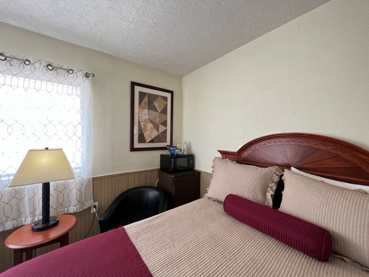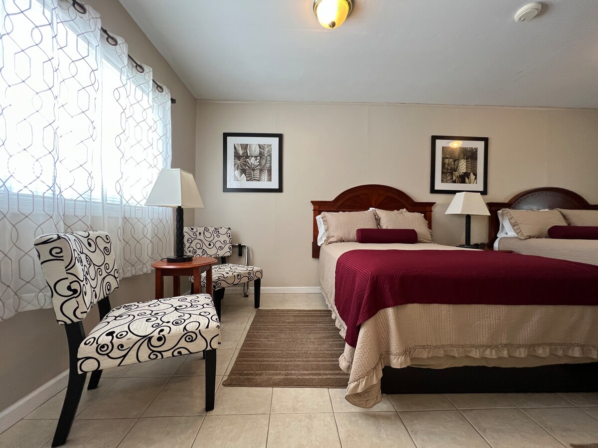 Room 5 at The Monticello Motel This motel room comes complete with two beds, a smart tv with streaming, wifi, a snack tray and toiletries to compete your stay.