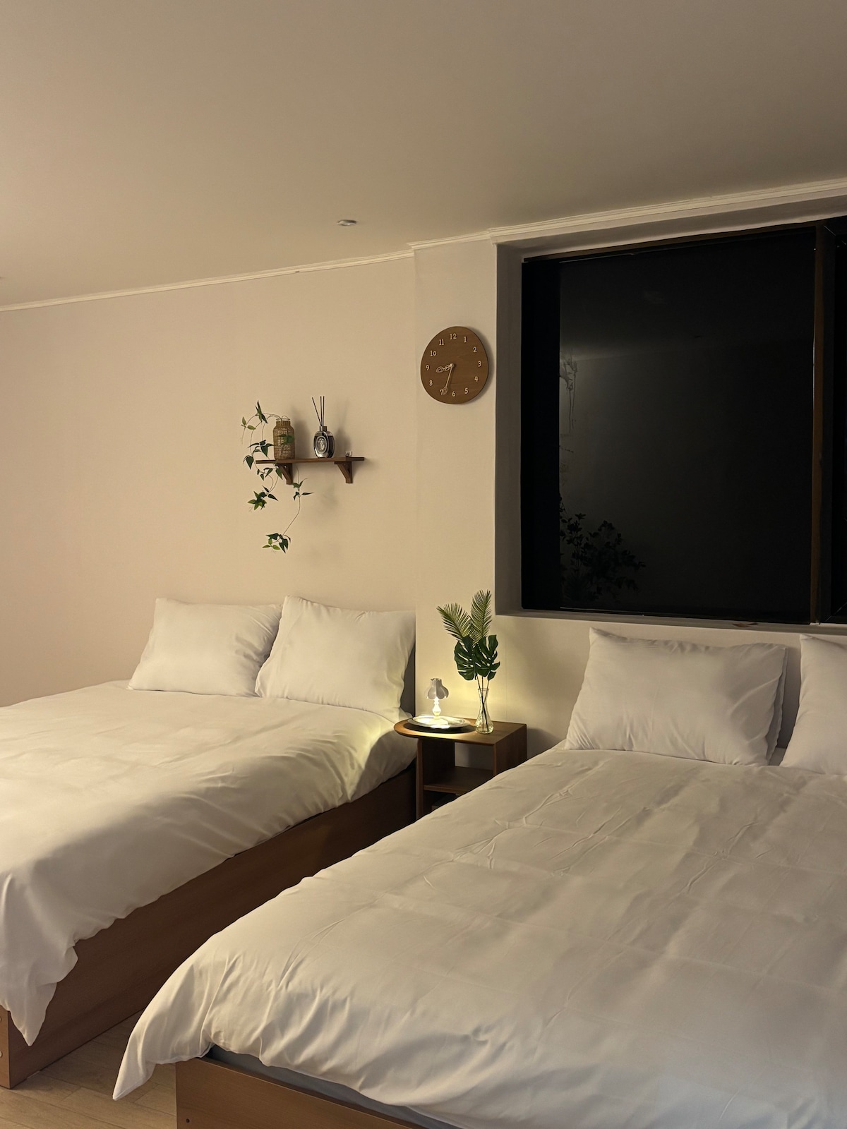 Mi casa está en el centro del pueblo. Puedes llegar desde la estación de Busan o la estación de Choryang hasta aquí en 7 minutos en taxi. Si llegas a mi casa, puedes hacer el check-in por tu cuenta. Mi esposa y yo hicimos diseño de interiores directamente, así que nos encanta más aquí. Ojalá usaras mi casa cómodamente como tu casa. El lugar por el que entras es el segundo piso y hay un sofá, una cocina, un baño. En el tercer piso, hay dos camas queen, un baño, un cofre.